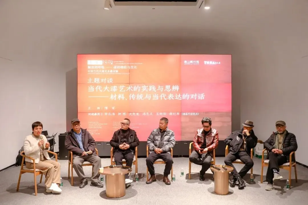 开幕式现场,邀请了参展艺术家代表,围绕展览核心议题,进行主题对话。本次对谈由傅军主持,汇聚李永清、林栋、沈克龙、汤志义、王向阳、翁纪军六位参展艺术家,以大漆的当代实践与文化表达为核心,分享对大漆物性的理解、髹涂实践中的探索与突破,畅谈如何捕捉漆树自愈的生命质感、激活传统漆艺的当代活力,以及在AI时代坚守手工温度的创作思考。