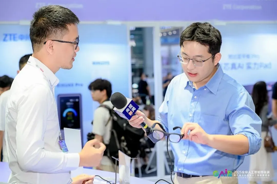 (2025全球人工智能终端展暨第六届深圳国际人工智能展,央视新闻记者正在采访AI眼镜企业)