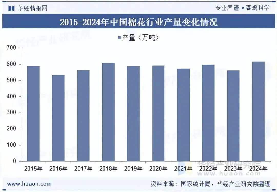 中国作为世界棉花生产大国,为国内棉柔巾行业的生产提供了充足的原材料保障。近年来,我国棉花产量呈现出波动变化走势,根据国家统计局数据,2024年我国棉花产量达到616.36万吨,较2023年增加54.57万吨。