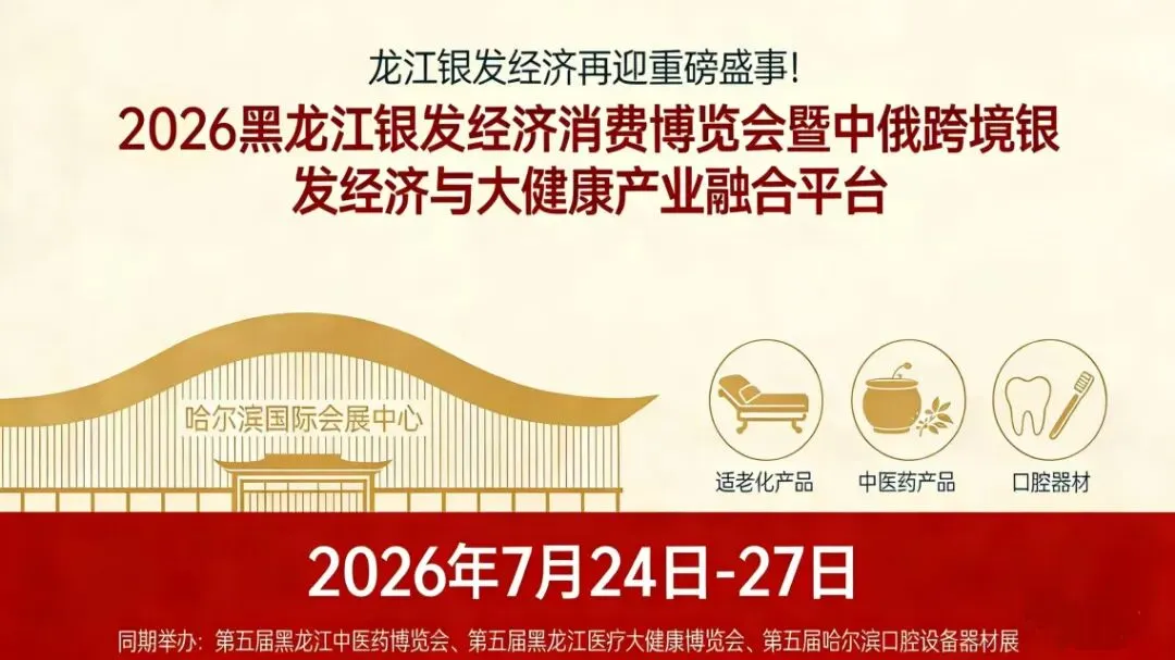 龙江银发经济再迎重磅盛事!2026黑龙江银发经济消费博览会暨中俄跨境银发经济与大健康产业融合平台,定于2026年7月24日-27日在哈尔滨国际会展中心盛大举办,同期还将开展第五届黑龙江中医药博览会、第五届黑龙江医疗大健康博览会、第五届哈尔滨口腔设备器材展览会,多展联动发力,解锁龙江银发经济新未来!