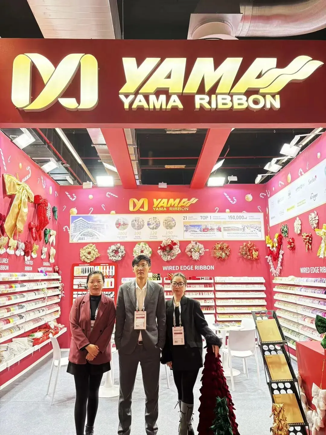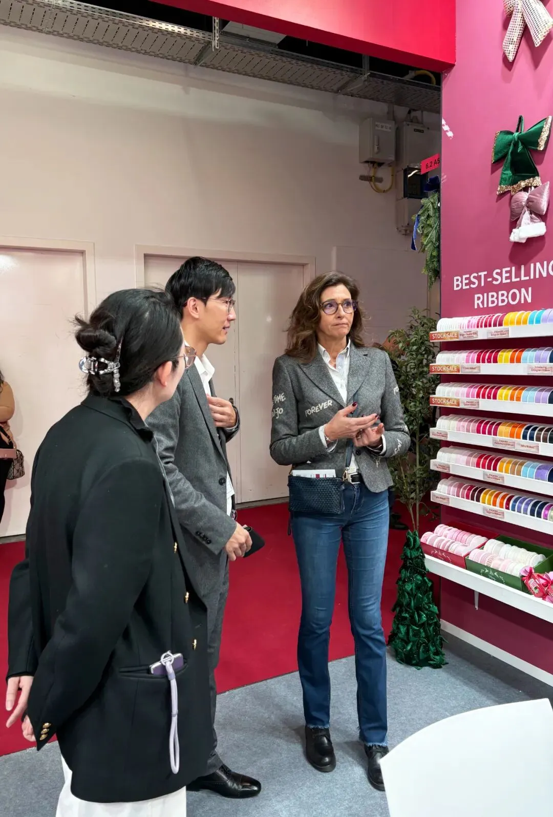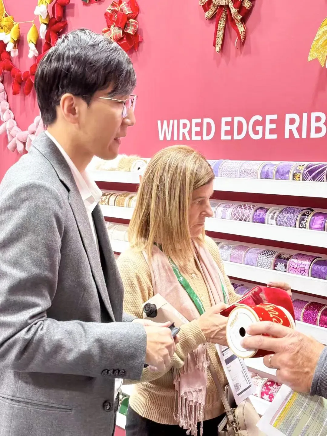 在展会现场,我们的专业团队始终以饱满的热情与严谨的专业精神,悉心对待每一次交流。面对客商关于织带产品的细致问询,团队成员均耐心聆听、详尽解答;当话题延伸至圣诞礼品包装、鲜花装饰及礼品篮定制等具体行业需求时,团队更结合场景,提供贴合实际的应用建议。流利的外语沟通与细致的场景化演示,让每一位来访者都能感受到我们真诚合作的意愿与专业可靠的服务态度。