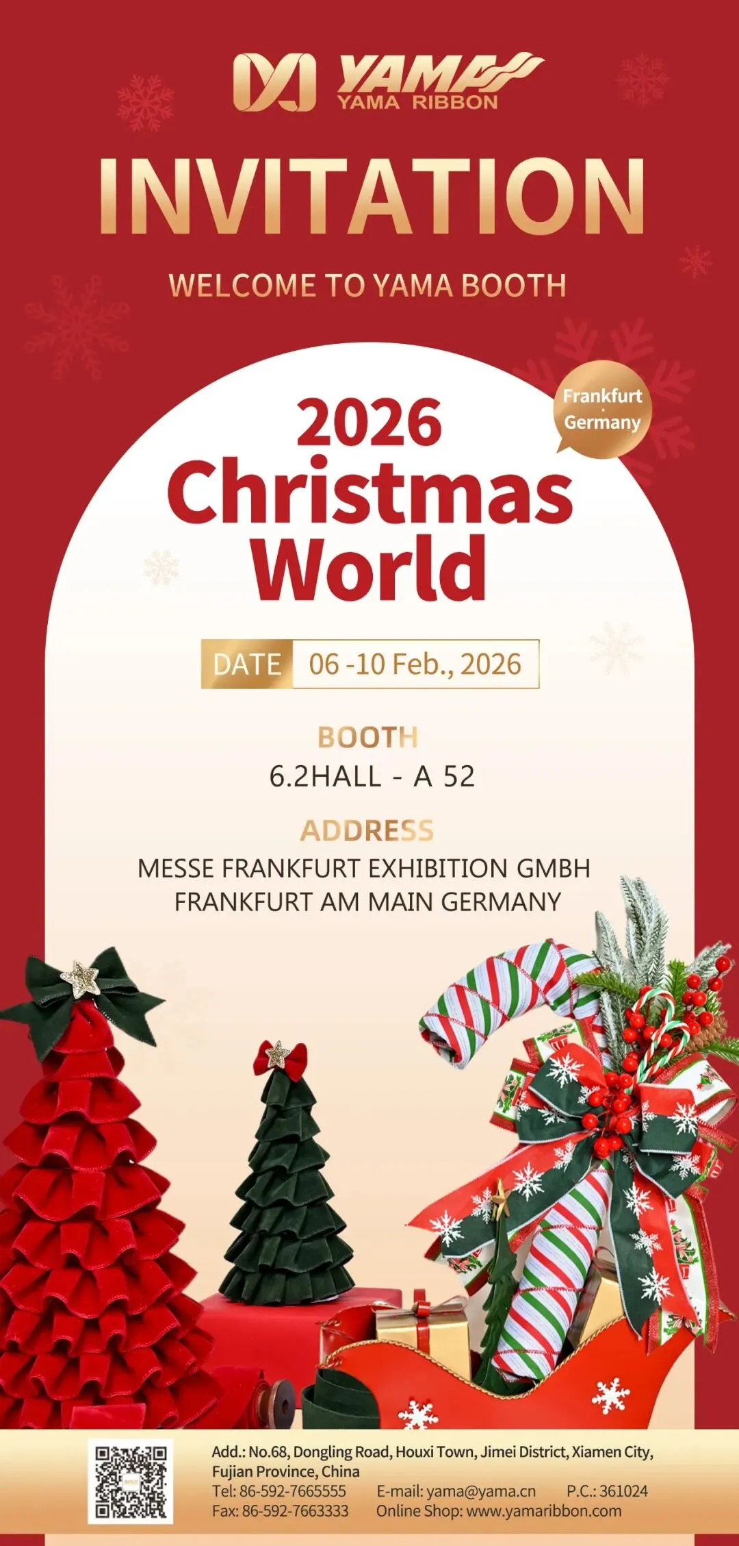 2026年 2 月 6 日 - 10 日,全球节庆装饰领域的顶级盛会 —— 法兰克福国际圣诞礼品世界展(Christmasworld)如期启幕。作为该领域公认的全球风向标,本届展会汇聚了来自世界各地的顶尖品牌、制造商与专业买家。姚明织带秉承一贯的匠心与创新精神,在展会上系统展示了针对全球节日市场的最新研发成果与成熟产品系列。我们在6.2号馆A52,迎接每一位莅临的商户,期待与您一起探索织带的精彩与奥秘。展会概况
