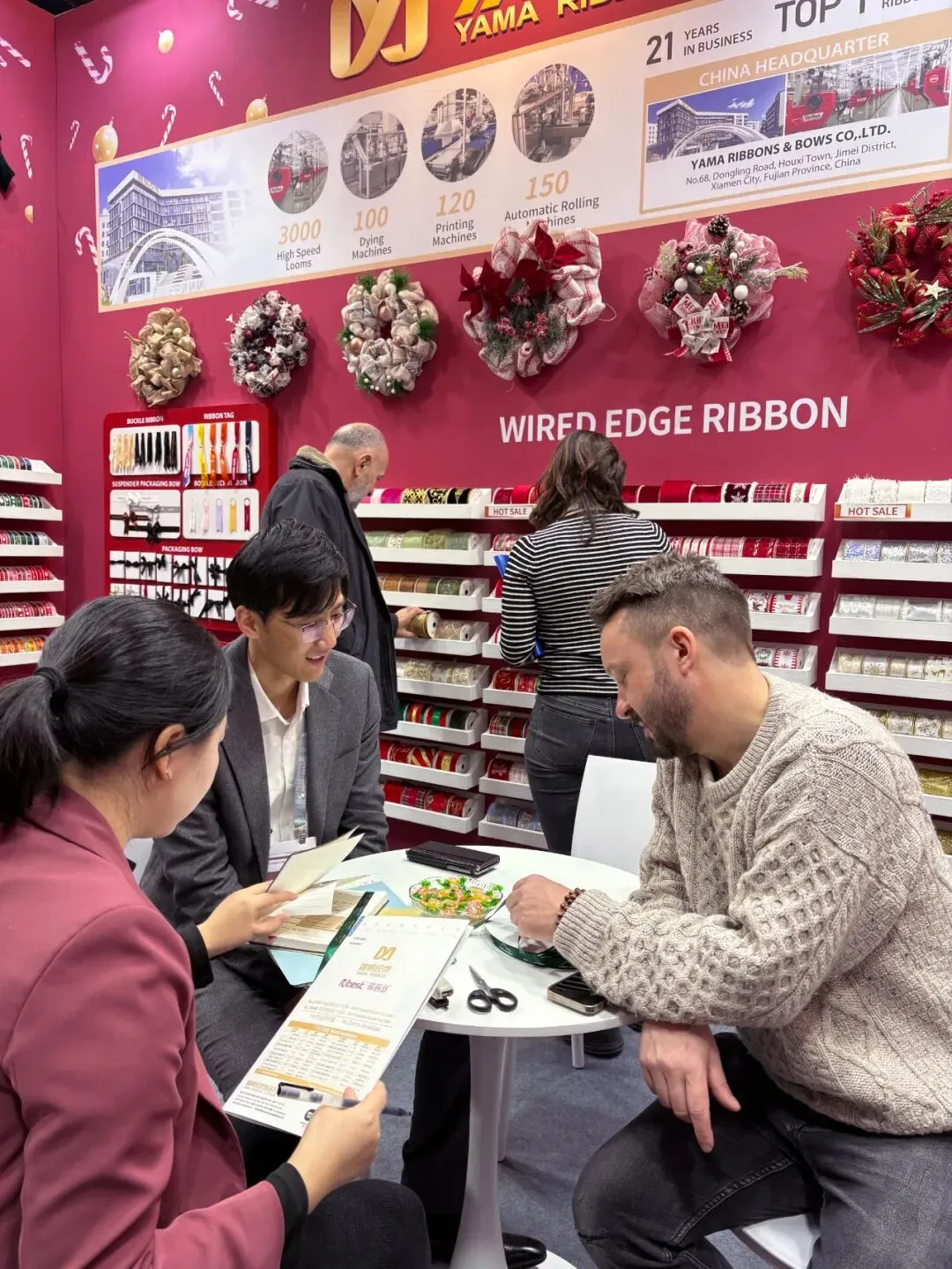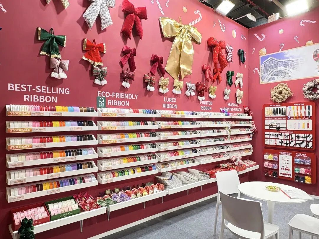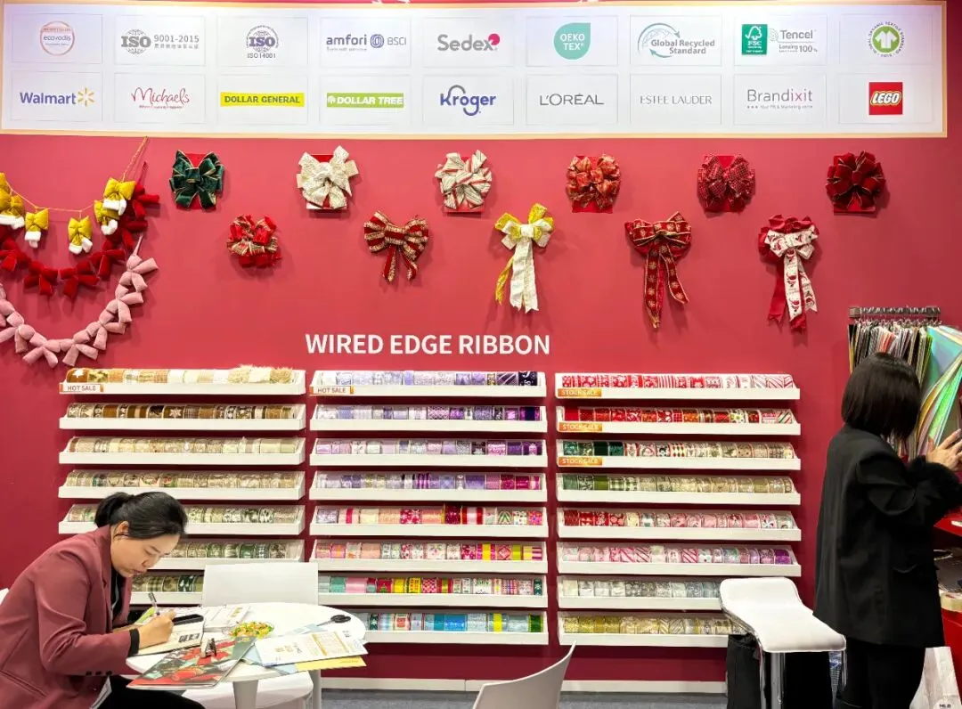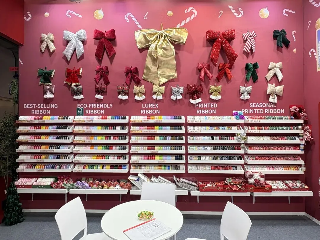 步入我们的展位,来访者便置身于一个精心构筑的节日氛围中。展墙上面整齐陈列着我们的产品,每一个角落都精心布置,旨在为您呈现织带在礼品装饰中的无限可能。丝带在灯光下流光溢彩,瞬间抓住眼球,更传递出宁静温暖的现代节日美学。拷克带精心制作的大型艺术花饰与花环,如同悬浮的节日符号,生动展示了产品的终极应用形态。而花结、机打花等成品,则让抽象的“丝带”概念转化为触手可及的美好。往来客商纷纷驻足,或轻抚织带感受质感,或翻阅色卡比对配色,展位前始终洋溢着热烈的交流气息。展会亮点
