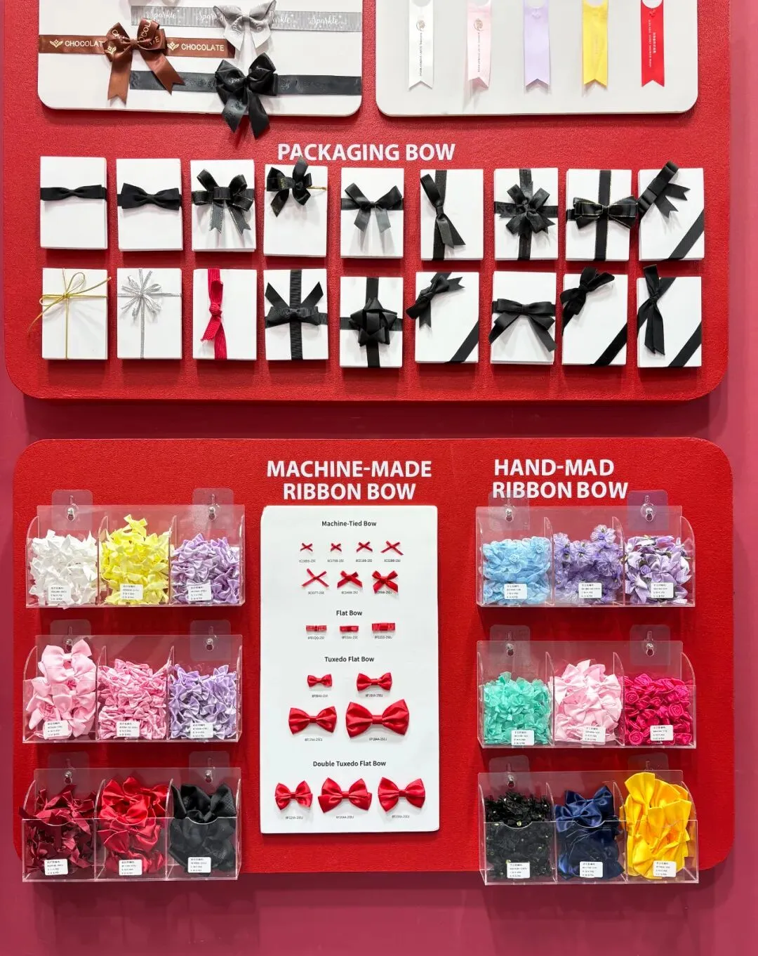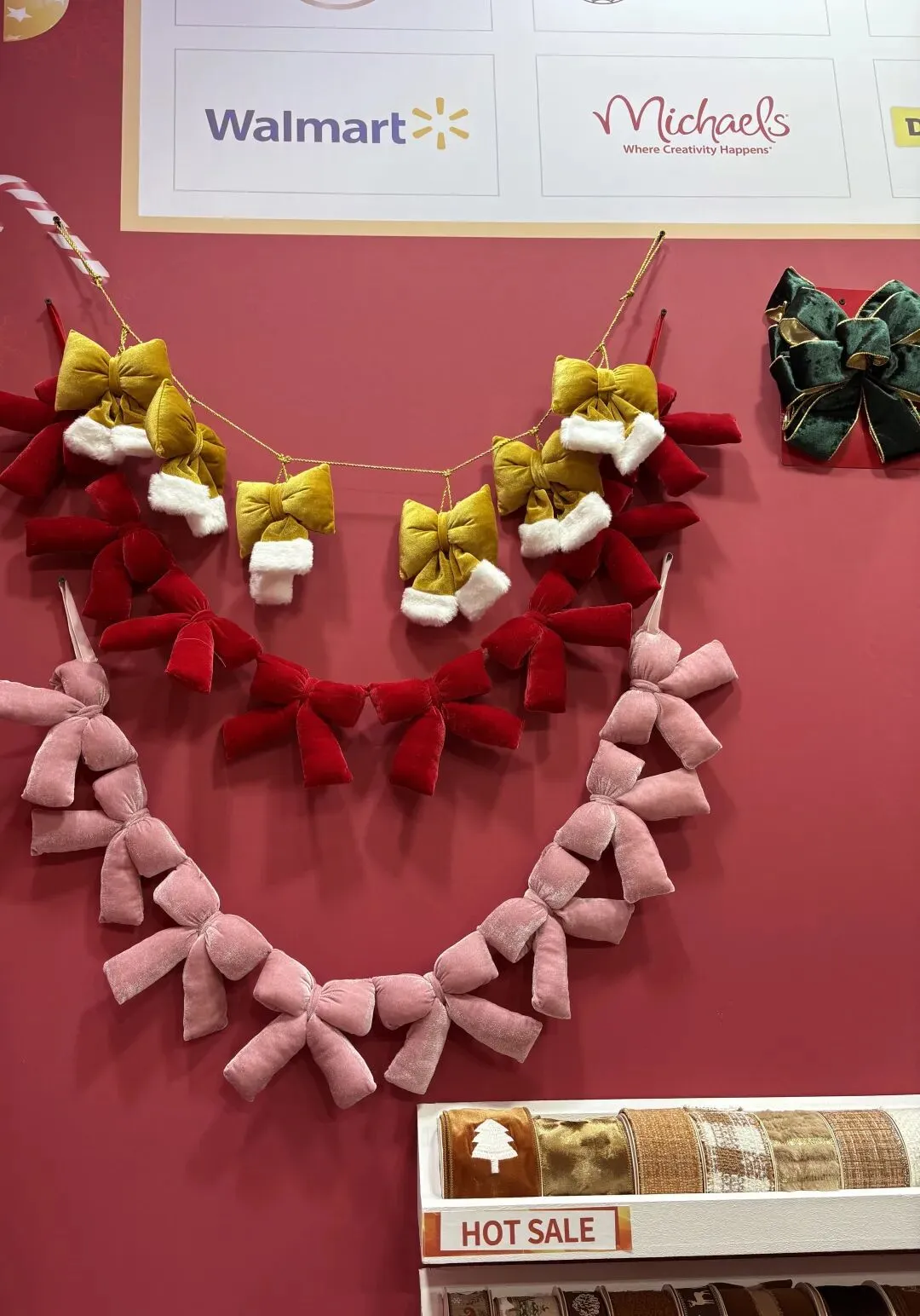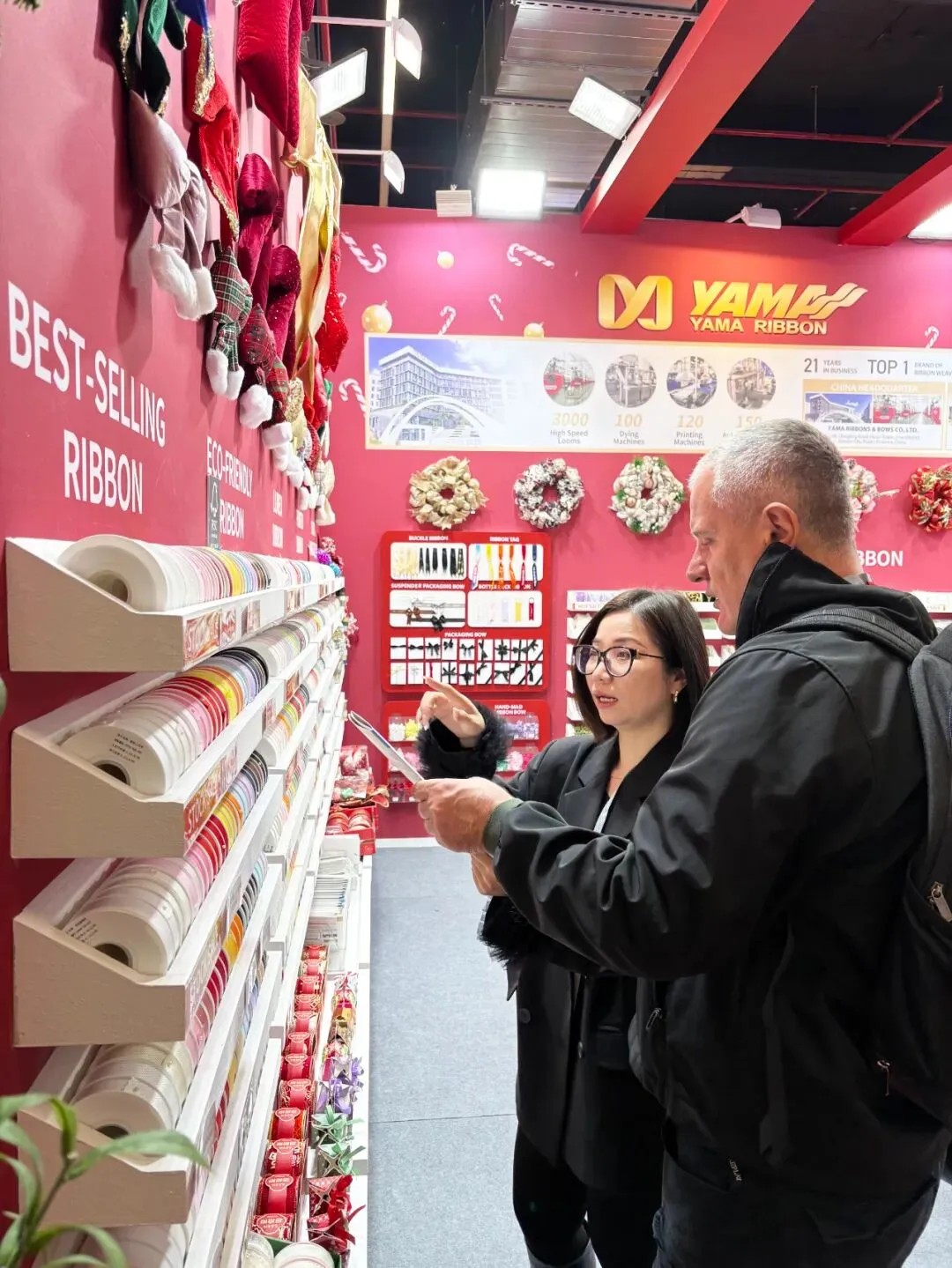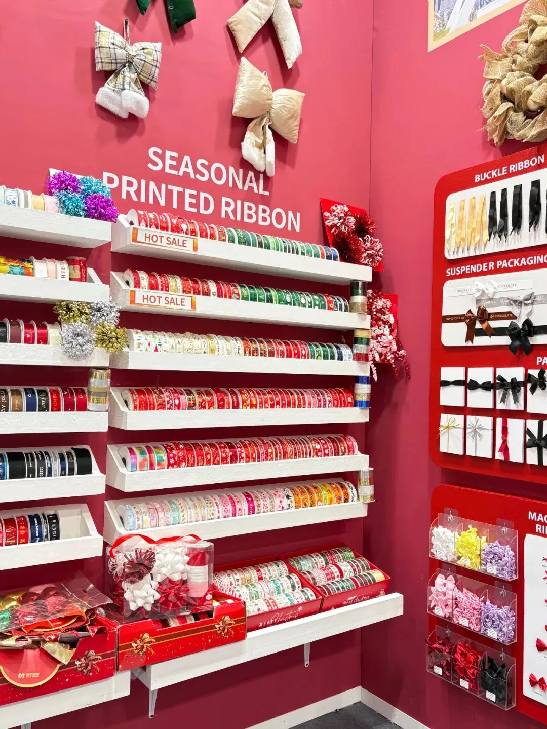 步入我们的展位,来访者便置身于一个精心构筑的节日氛围中。展墙上面整齐陈列着我们的产品,每一个角落都精心布置,旨在为您呈现织带在礼品装饰中的无限可能。丝带在灯光下流光溢彩,瞬间抓住眼球,更传递出宁静温暖的现代节日美学。拷克带精心制作的大型艺术花饰与花环,如同悬浮的节日符号,生动展示了产品的终极应用形态。而花结、机打花等成品,则让抽象的“丝带”概念转化为触手可及的美好。往来客商纷纷驻足,或轻抚织带感受质感,或翻阅色卡比对配色,展位前始终洋溢着热烈的交流气息。展会亮点