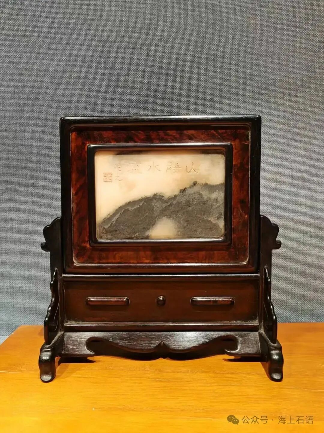 一组奇石文房器玩,小巧玲珑,器形多样。文房诸宝砚为首要,以天然画面石作砚屏始于欧阳修,天然奇石作砚则始于苏东坡(“天石砚”),这也是宋代赏石高峰的重要符号,这组奇石文玩带有向宋贤致敬之意。大理石砚屏十分小巧,小有年纪,山水画意,有清代重臣、学者阮元刻铭(寄托款);彩陶石砚造型周正,带有砚池;泥石墨为猪肝色,细腻纹理如同古墨漆皮裂纹;大湾石笔架质地玉化,峰谷幽深;此外还有马料笔舔、黑金刚蟾形镇纸等。