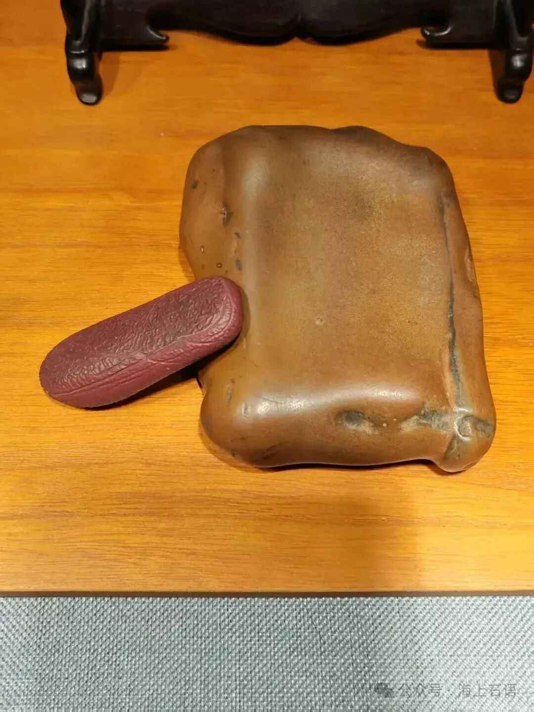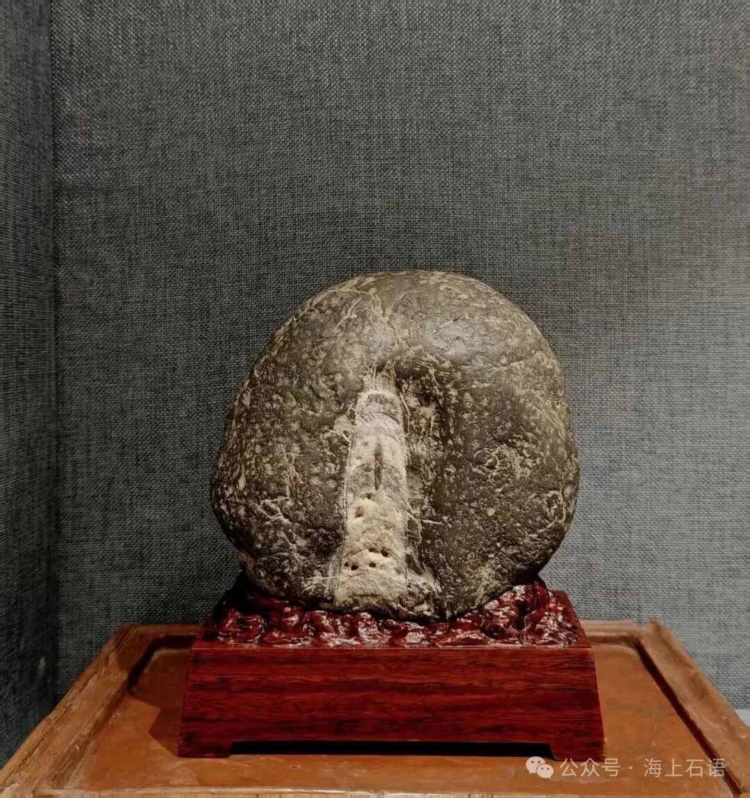 震旦角石,是生存于中奥陶世(距今约4.4亿-5.1亿年前)的头足纲鹦鹉螺亚纲古生物化石,因其形象特征古代俗称“笋石”、“宝塔石”,一直作为一种重要的观赏砚材。可能是因为中国所产(主产于湖北宜昌、恩施及陕西等地)开发最早、拥趸最多的原因,百度百科称其“为中国特有化石”,其实大谬,如今非洲摩洛哥等地均有大量角石开发出口。但是,角石大都深藏于岩芯,非剖岩打磨无法窥其美,这方角石“虎丘塔影”却是一方长江水冲原石,特征明显,画面清晰,意境幽远,十分难得。