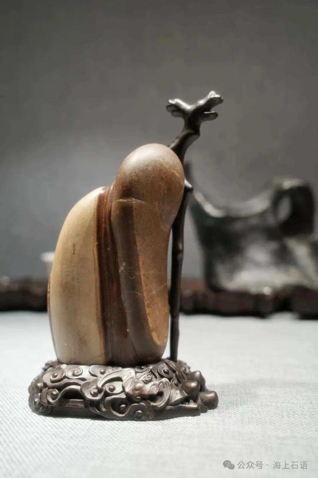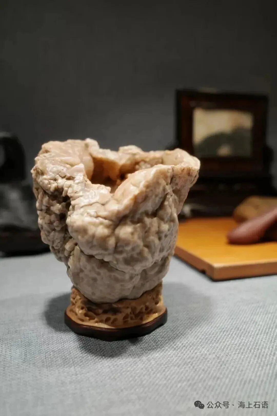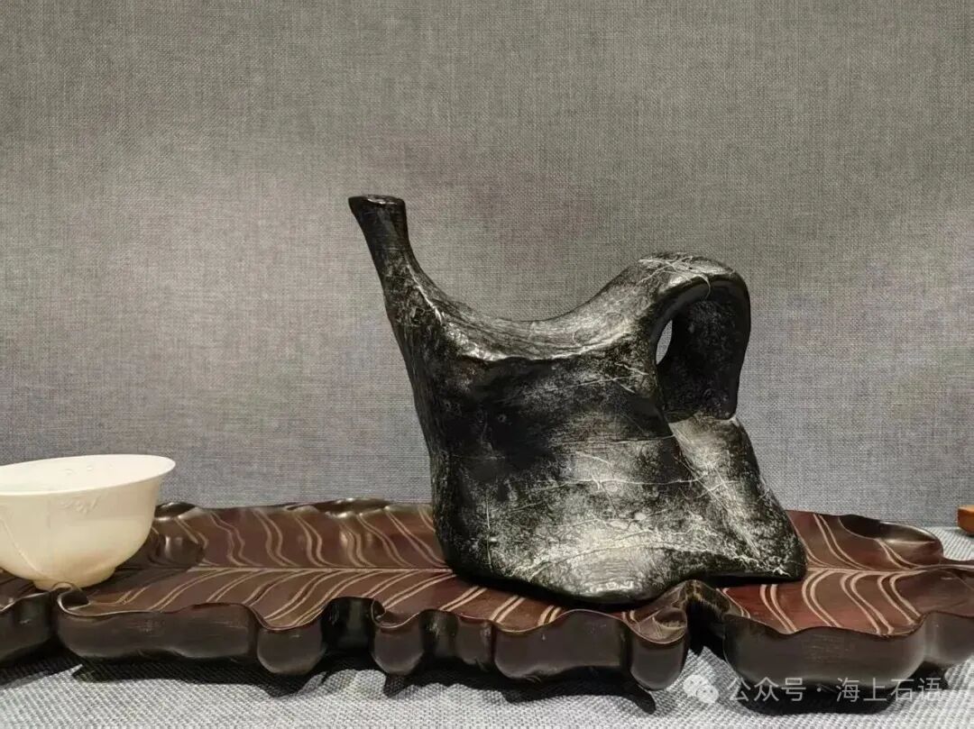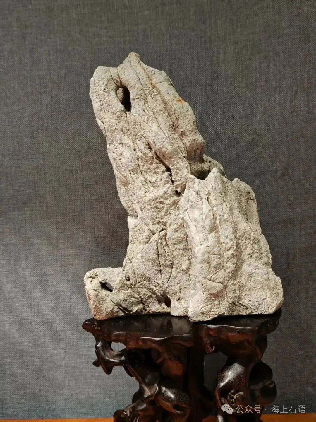 太湖石是最具历史文脉的赏石品种,一方“本太”山子极富古意,造型奇崛,皴理细微,皮壳干爽,底部有修治。来宾考洞石则是新晋的赏石品种,一方“天壶”造型逼真,表皮朗润,线条流畅,具有现代感。古典与现代,可谓各具韵意,各逞其美。