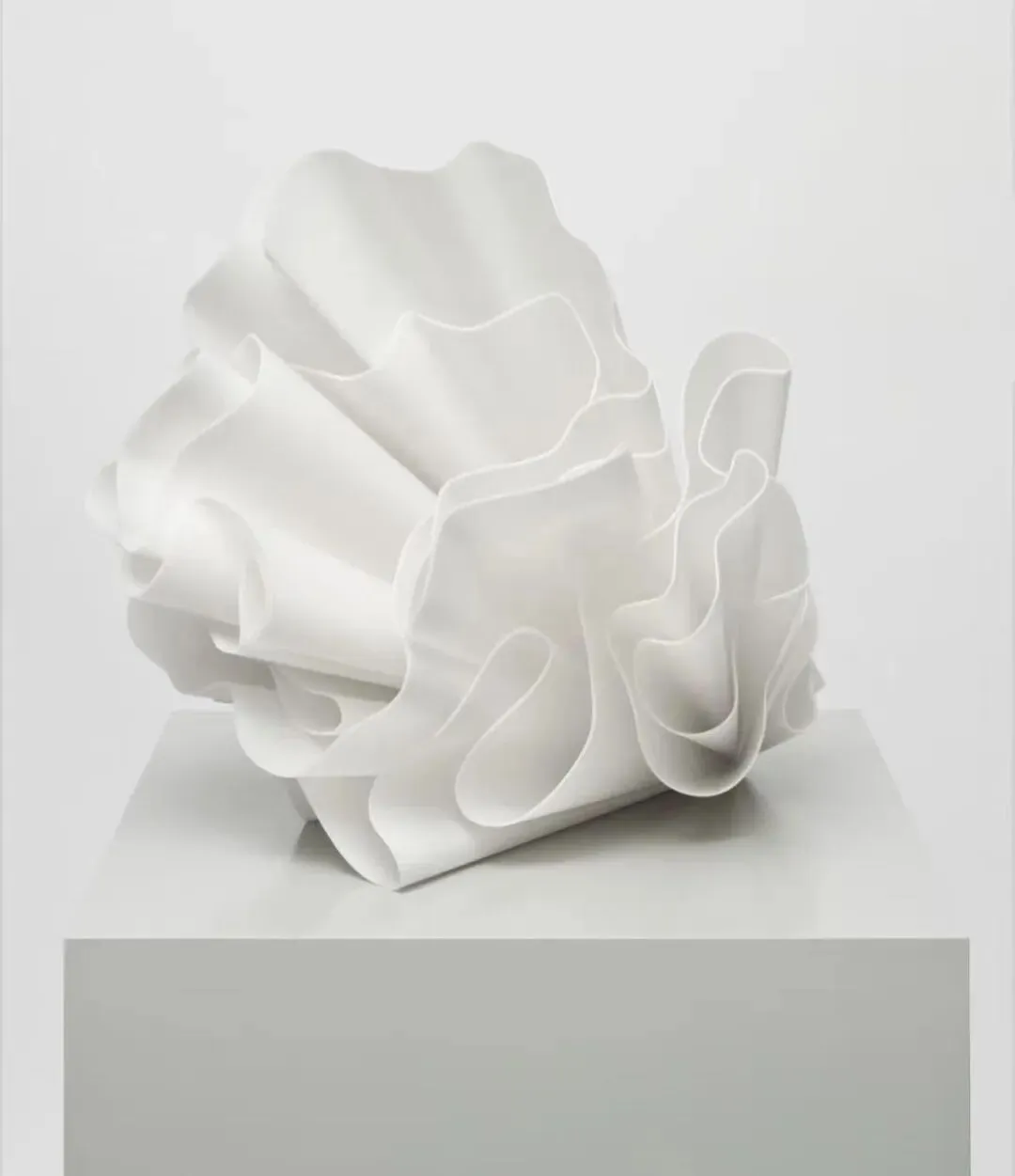 展览《尘熹》中的七位艺术家,都采用一种高度理性的、关注物质与过程的方法,致力于将无形的能量、记忆、物理规律或认知过程,转化为一种融合了多种感官体验的、具有物质实体的艺术形式。爱丽丝·艾科克(Alice Aycock)的艺术实践关注能量、运动与结构在空间中的转化。她常将风、涡旋等自然力或机械运动的无形轨迹,通过大型雕塑具象化为具有动态张力的形态,使不可见的物理过程获得物质实体。其作品常介于建筑与雕塑之间,通过迷宫、塔楼等可进入或引发身体联想的空间结构,强调观众的物理体验与心理参与,而非单纯视觉观看。Aycock广泛涉猎科学史、控制论与哲学理论,并将其概念转化为视觉语言。她将工业材料与建筑元素视为承载历史记忆与科学隐喻的媒介,使作品成为思想过程的物化呈现。在其创作中,能量流动的抽象意象、建筑结构的体验性以及科学观念的转译相互交织,形成一种理性结构与感知体验并重的艺术表达。爱丽丝·艾科克,跳华尔兹舞的玛蒂尔达,2012年,涂漆聚酯树脂,63.5x61x74cm