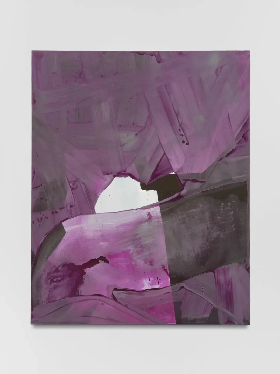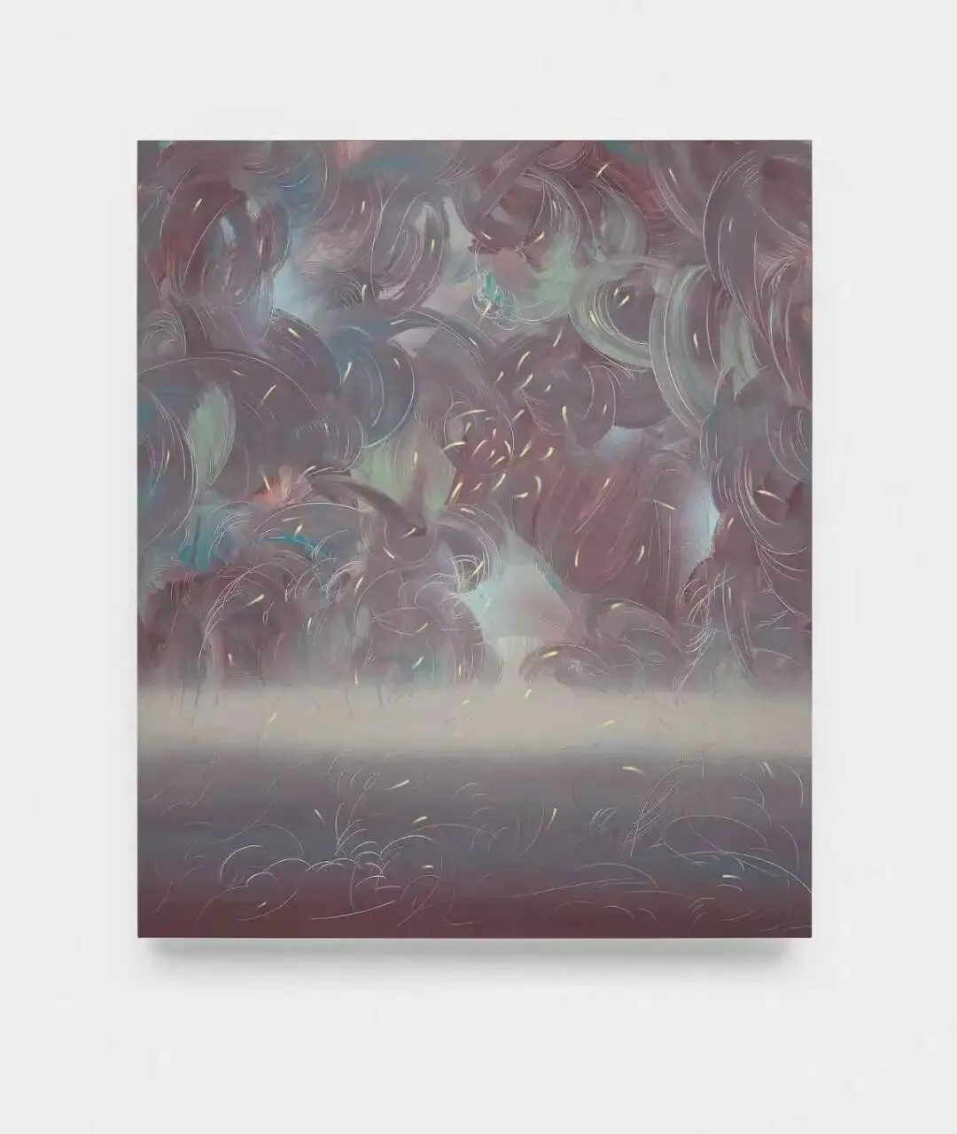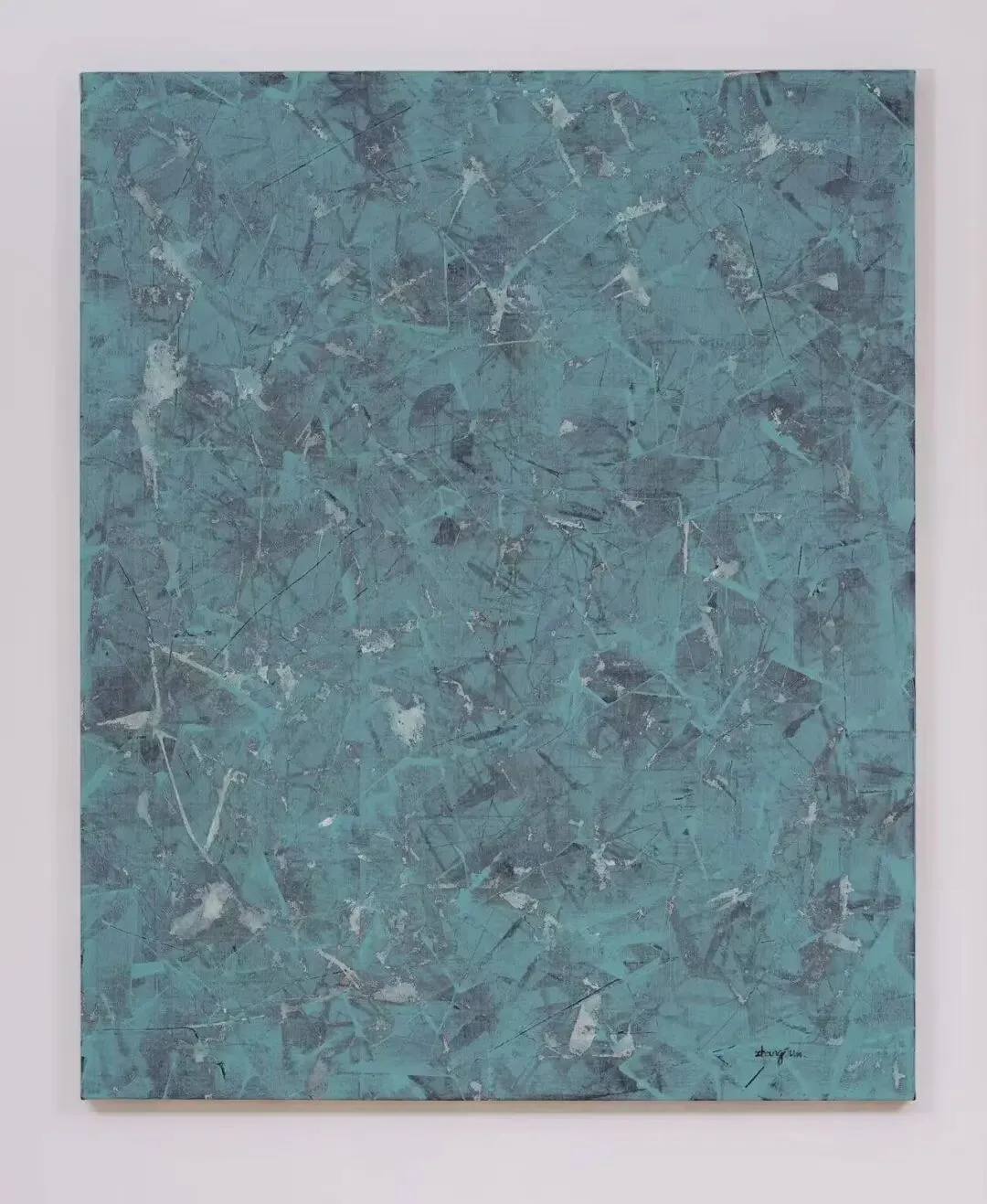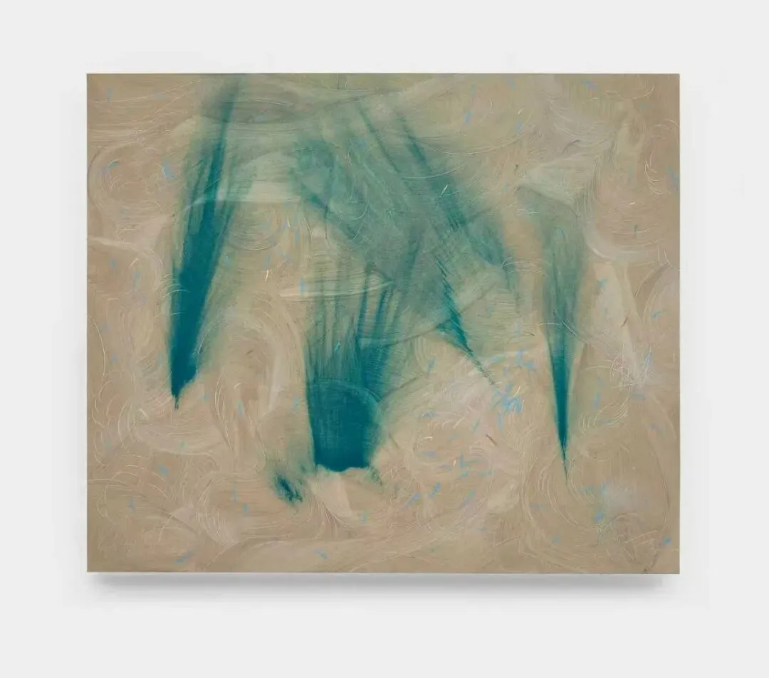 徐升的雕塑创作呈现出从自然意象向数字抽象的演变轨迹。其早期作品如《千层浪》以泡沫材质捕捉海浪的瞬间动态,仍带有具象的自然隐喻。而在《双重进入》系列中,他通过VR技术在虚拟空间中直接构建形态,使创作逻辑从手工塑形转向数字生成。这一技术介入使“浪”的意象被解构为意识流动的抽象结构,最终以青铜铸造呈现为几何化、断层化的冷感形态。作品因此从对外部自然的模仿,转向对内在认知过程的可视化探索,体现了创作媒介与形式语言的深度转化。徐升,《双重进入》,铸铜,58x32x60cm张骏的绘画作品在技法层面采用了色域绘画的平面化色彩基础,同时通过硬质刮板在画布上制造出具有触觉感的肌理痕迹。这些刮痕在本来已经提纯的画面上形成深浅不一的线性结构,这种技法促使色彩感知的适度地再丰富化:痕迹不仅打破了色域的平整性,色料的厚薄,在简单颜料的色彩关系中制造了适度多样化的色感视错觉。其中有颠倒的美术史逻辑在里面。在张骏本人的表述里,肌理的排布被视为自然流动感在幻想中的拟象、也就是对“风”的气息的再现。张骏,风生系列-湖面有风,130 × 160cm,综合材料,2025