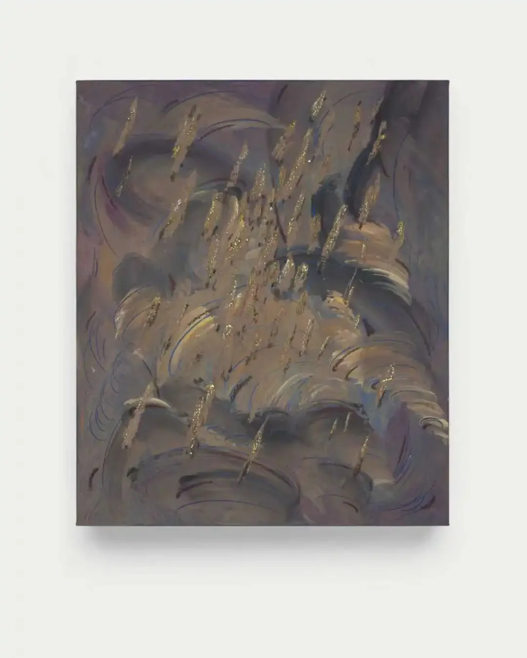 曹太平的绘画将农村生活与劳作场景中常见的非具象元素——如飘散的炊烟、流动的气流、翻耕时扬起的尘土轨迹——抽离为画面意象的基础。这些源自农耕经验的视觉片段,本身携带土地的温度。然而在形式经营上,艺术家并未停留在田园牧歌气质的再现,而是通过多层面的形式手法的重叠植入,将感性记忆纳入高度自律的抽象绘画性中。画面中似乎有种对农耕经验特有的诗意与温度的追忆执念,又融入了更加冷感的技术材料所带来的质感。乡村记忆的空气在早已高度城市经验化、画室经验化的现实中飘荡,构成既熟悉又疏离的视觉场域。这种创作方式对应着艺术家对自身精神认同的复杂心境。而在曹太平的其他创作中,异质层面的复合叠加性往往表现得更为突出。曹太平,播种 2,布面丙烯、油彩,130x110 cm,2024