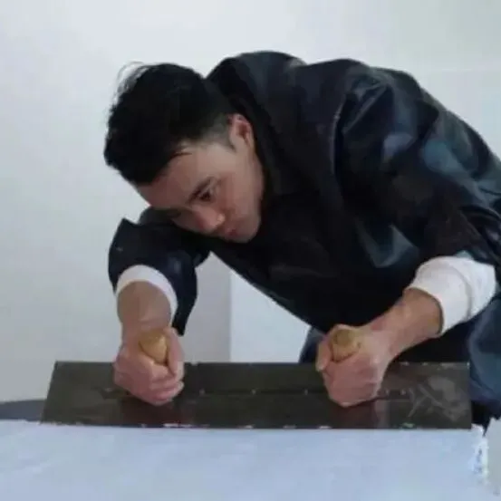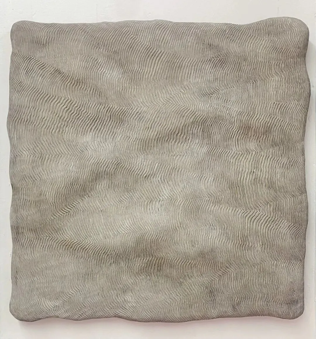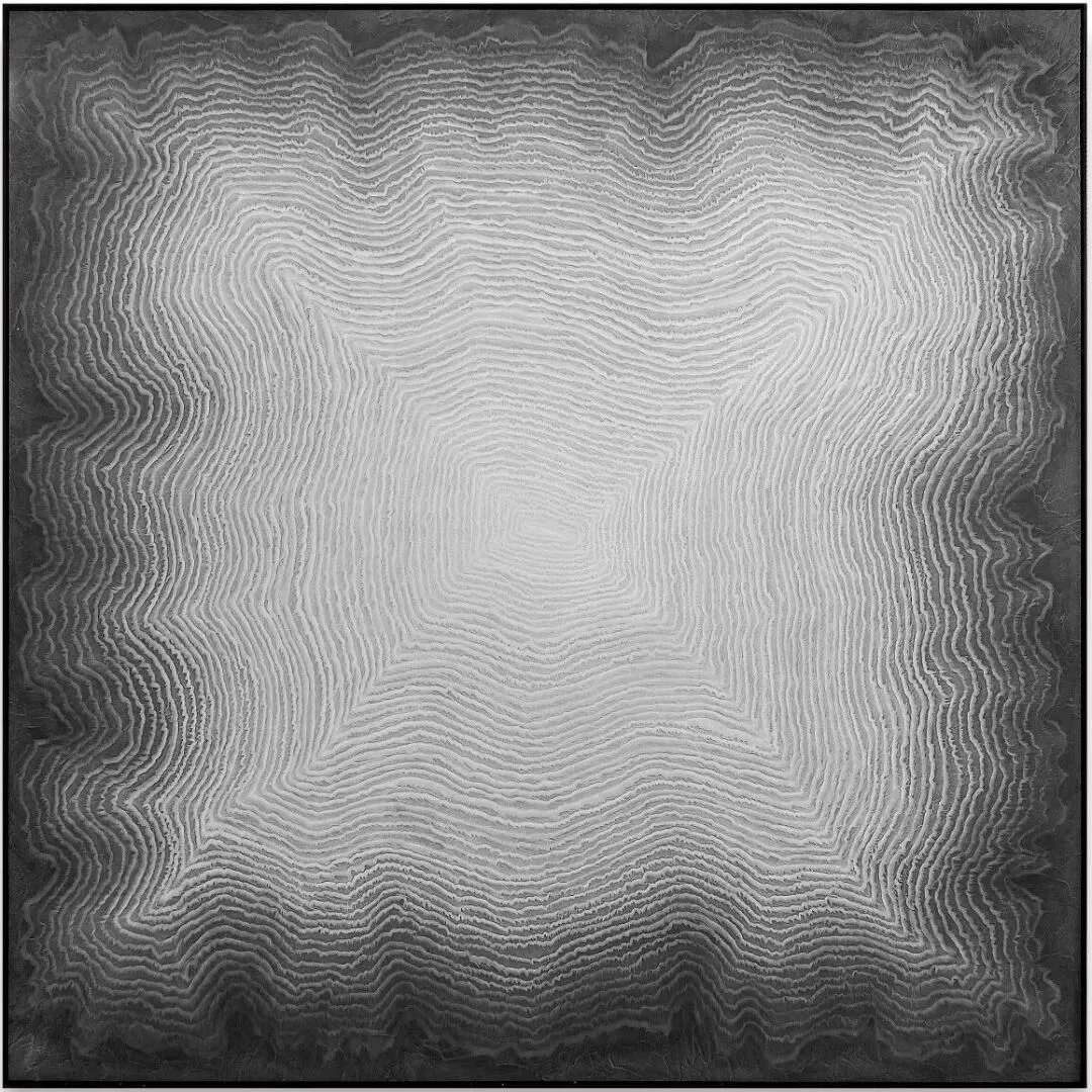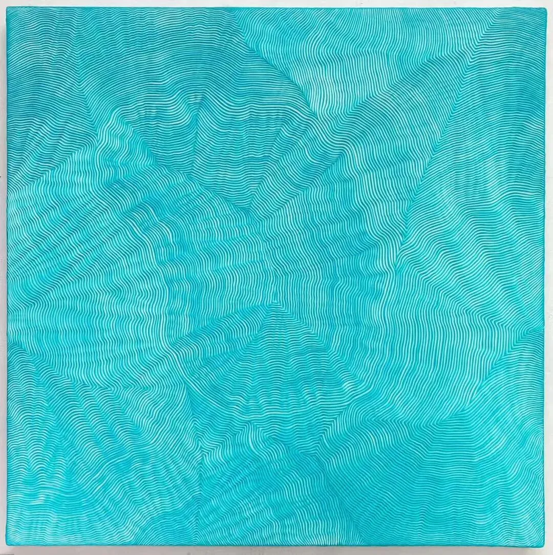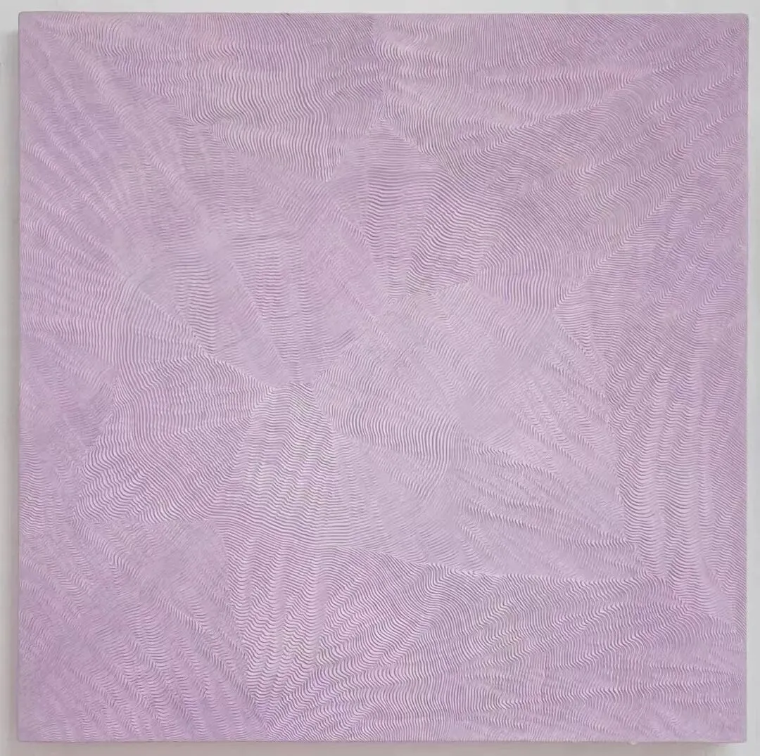 李军政的创作处于抽象绘画的形式谱系中。抽象画长期以构成性为主导,极简主义对物质性的探讨为触感式视觉的出现提供了条件。他的作品结合了单色画或色域绘画的视觉场域与线性浮雕的实体触感,方法是通过反复堆积丙烯颜料并进行刀刻,在单一色域内部形成平面装饰性语言脉络下的三维线刻结构。这些由切割产生的“线”是物质层面的痕迹,而非绘制的图形,从而使绘画的视觉性与雕塑的触觉性得以交织。尽管作品在视觉上呈现出较高的工作量密度——包括层层笔触与密集的剖面线条,但其结构因具备重复性特征,而可以被理解为一种似繁实简的表达方式。李军政,浮光20251106,106x107cm,木板丙烯,2025