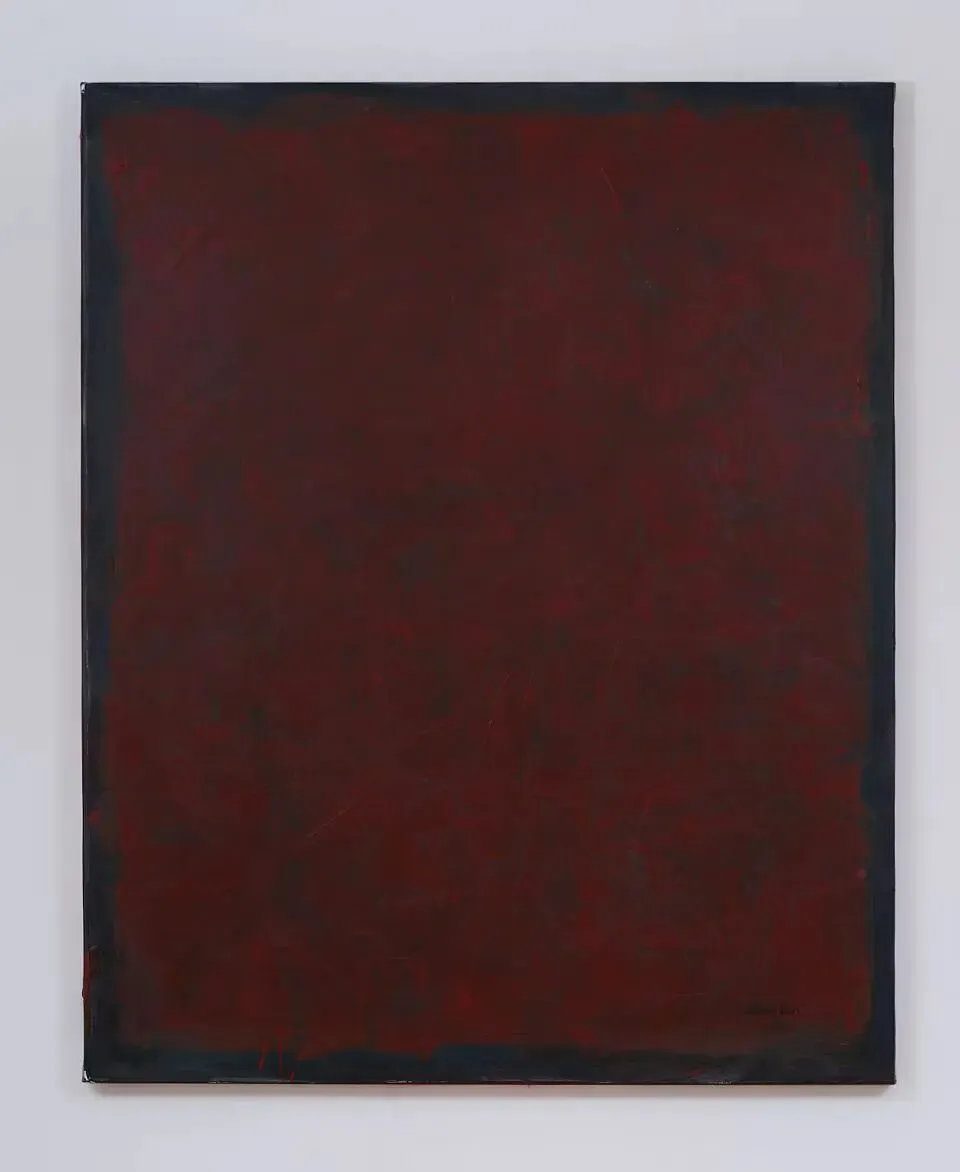 Daniel Lergo的绘画实践以对色料物质性的开展为核心,持续使用单一颜料进行创作,通过控制其在不同底色上的密度与层次,激发色彩从深褐到火红、或从亮绿到墨黑的内在色谱广度。他将颜料视为具有物理属性的物质材料,而非视觉符号,从而在极简的用色中展现丰富的质感变化。其作品常以天文学、物理学概念为结构基础,绘画形式中或许掺入了自然现象的摹写转化,处在纯形式与摹仿的间性中。例如,在《红移》中以画幅尺寸的递增模拟宇宙膨胀,或在金属系列中通过氧化反应呈现元素的化学潜能,绘画似乎成为不可见物理过程的视觉化载体。他强调基底作为“光学界面”的作用,荧光底色通过与表层颜料的互补、透射等效应,主动参与色彩建构。此外,作品的展陈,经常会有剧场化的空间装置特性。Daniel Lergon,无题,布面逆向反射颜料与油彩,200 x160 cm,2025
