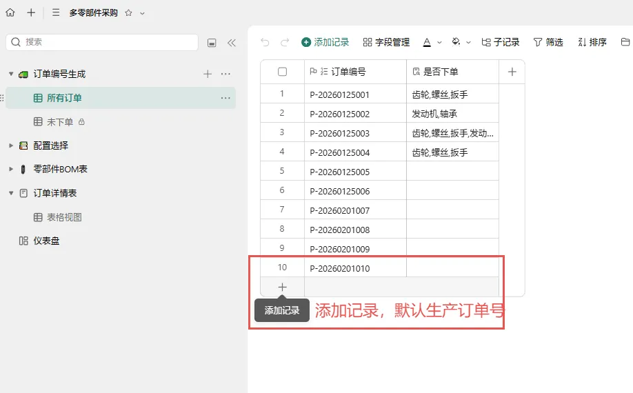 进入 零部件BOM清单表,系统已自动关联订单 P-20260201010,并带出各物料的默认数量。 如需调整数量,可直接在表中修改(例如齿轮改为10个,螺丝改为100个)。
