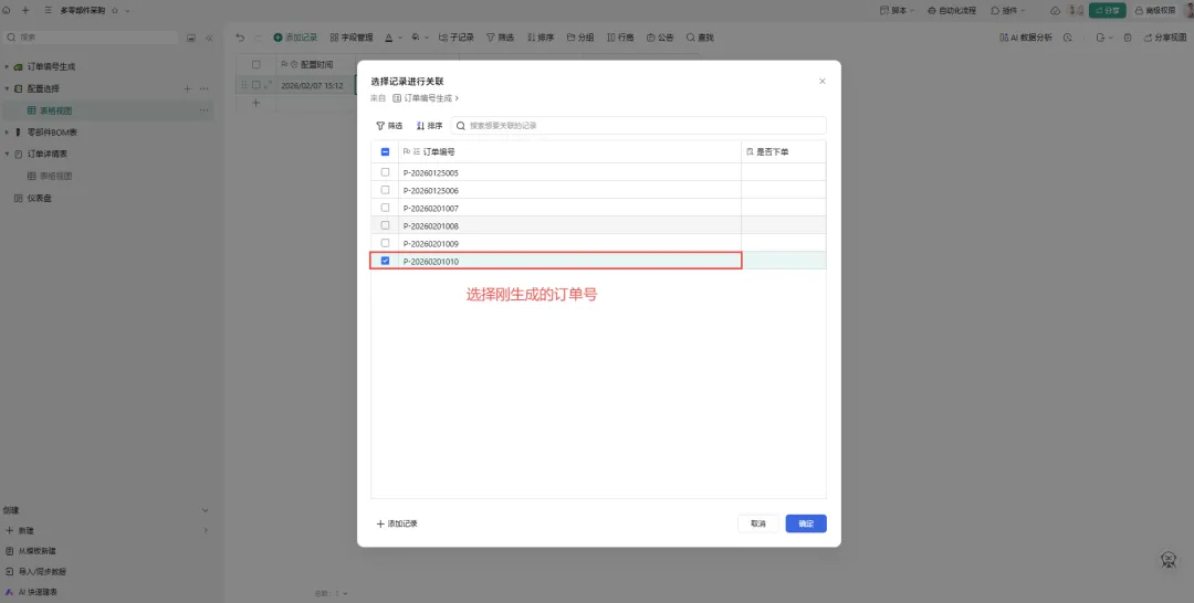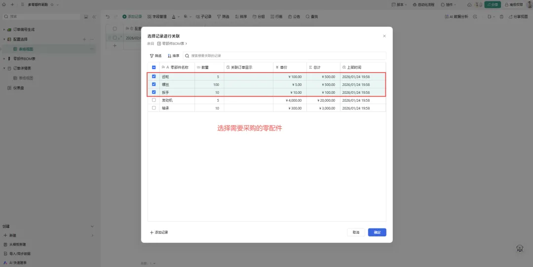 进入 配置选择表(仅使用唯一行操作)。 在“订单”字段中选择刚生成的 P-20260201010订单号。在“零部件”多选字段中选择所需物料,例如:齿轮、螺丝、扳手。 点击确定。