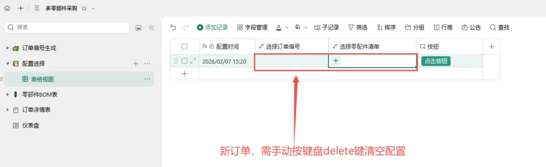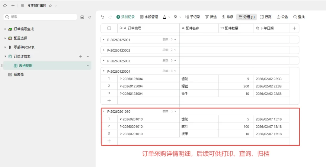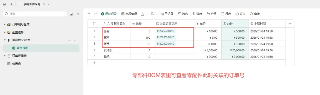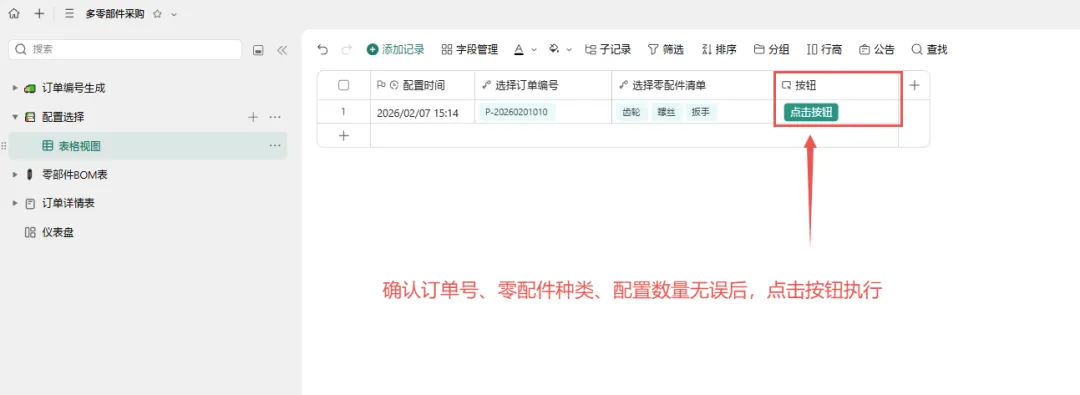 回到配置选择表,点击“执行”按钮。 系统自动将配置好的零部件及数量汇总,并写入 订单详情表。 此时在订单详情表中即可看到 P-20260201010订单的完整采购明细。