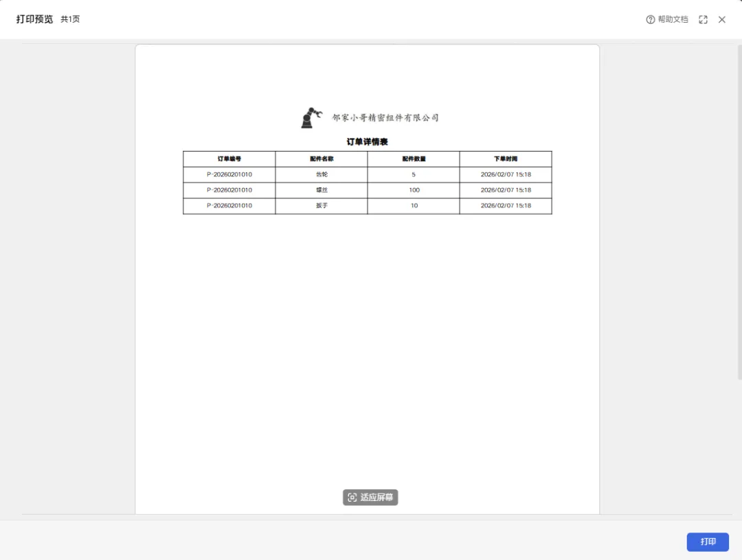 开始新订单前,需在配置选择表中清空当前行的选项。 在BOM表中确认无残留关联数据后,即可按上述流程处理新订单。 已下单的订单编号将不再出现在可选列表中,避免重复操作。 打印:通过自定义打印功能,选择打印订单详情。