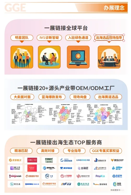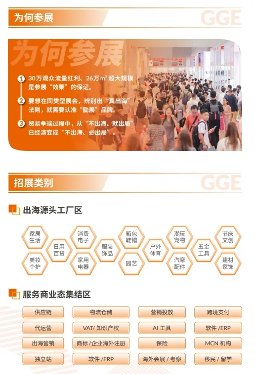 GGE首创 “跨境出海+礼品家居+移动电子+包装物流”四展联动。这不仅是逛一个展,而且是: