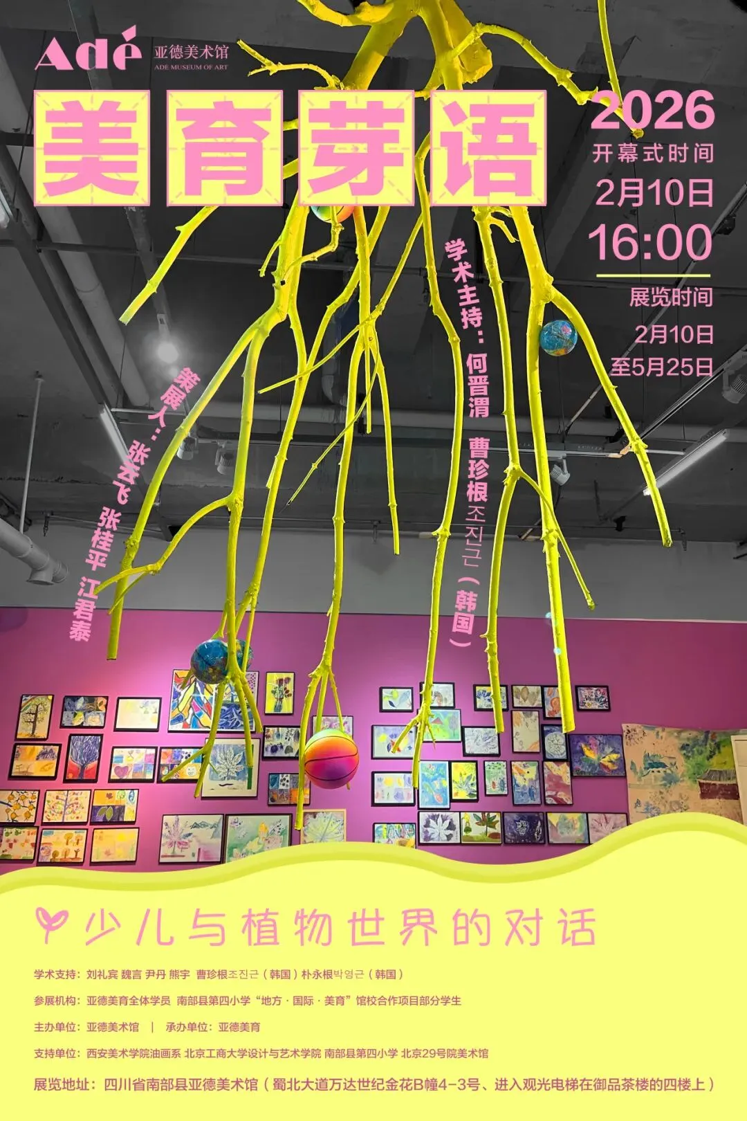 2026年2月10日16:00将在亚德美术馆举办“美育芽语——少儿与植物世界的对话”展,这是一场跨学科“艺术与植物”的视觉盛宴,这是一场常年少儿艺术公益培训课程的展示,这是一场植物景观沉浸式的现场体验!是亚德美育学生通过近三个月艺术与植物的跨学科实践,创作出多组富有创意的作品,成果聚焦自然素材艺术化重构、以跨学科知识融合,指向重构人与自然的关系,让美育回归艺术释放情绪的过程。对自然环境温暖见证。让美育回归情感本源。这是亚德美育长年公益免费培训后,学生们获得了优秀的成果展示。欢迎大家届时出席开幕式!