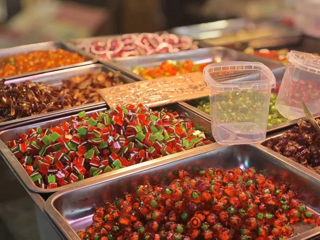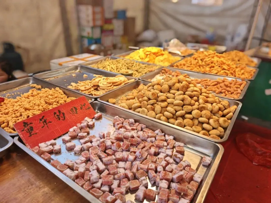 尖筒形状、薄片形状、圆球形状……各式各样的油炸小点心,满当当地摆在摊位上,靠近我们走道这一边,还放了一个小盒子,里面是供食客品尝的小样。