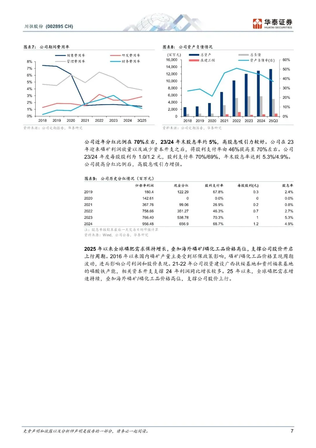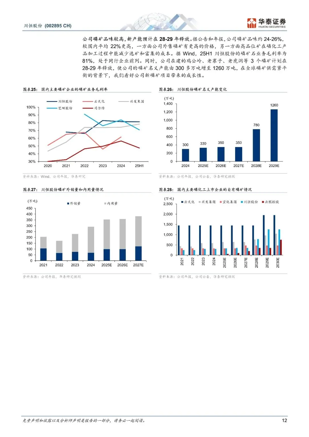 首次覆盖川恒股份给予"买入"评级,予以公司26年19xPE,目标价50.73元。公司是国内磷化工的龙头企业,拥有磷矿名义产能3330万吨,自有磷矿优势使公司磷化工毛利率处于行业前列。受益于未来1-2年的全球磷矿供需紧平衡局势,我们认为公司磷矿仍有望延续景气,且在新能源需求增长预期下,公司的磷酸铁、工铵、磷酸等业务亦有望贡献弹性。公司股息拥有较高吸引力,我们假设公司在70%股利支付率水平下,2527年股息率达3.7%/4.5%/5.0%。