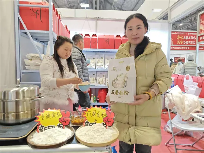 传统工艺的坚守者也在大集中找到展示的窗口。年货节上,一家新郑石磨面粉品牌的展位负责人卢彩霞正向顾客耐心解释:“这是石磨一点点磨出来的,保留了麦芯和胚芽营养,和高温机械加工的普通面粉不一样。”