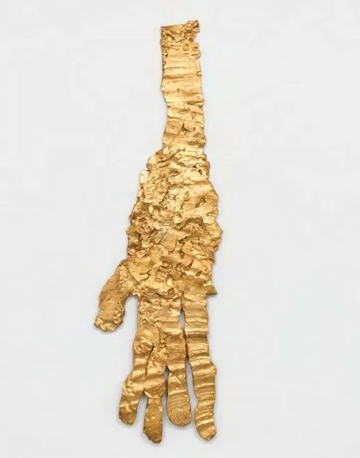 白立方展示了巴塞利兹(Georg Baselitz)于2019年创作的《艺术家之手》(Artist's Hand)金色作品,标志着他在休整六年后重返雕塑领域。这些青铜浮雕最初在工作室里用塑胶泥捏塑而成,巴塞利兹曾表示,他渴望亲手触摸并掌控物质。放大后的作品采用古老的“火法镀金”工艺,这是一种将黄金融入表面的传统技法。在艺术家看来,这种发光的深度与色泽远比任何油漆表面更具生命力。