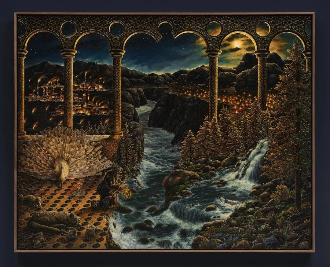 Raqib Shaw,Echoes Over Arabia I, 2025,Acrylic liner and enamel on birch wood,109x137x5.5cm © Raqib Shaw,摄影:Eva Herzog,图片由Thaddaeus Ropac画廊提供。