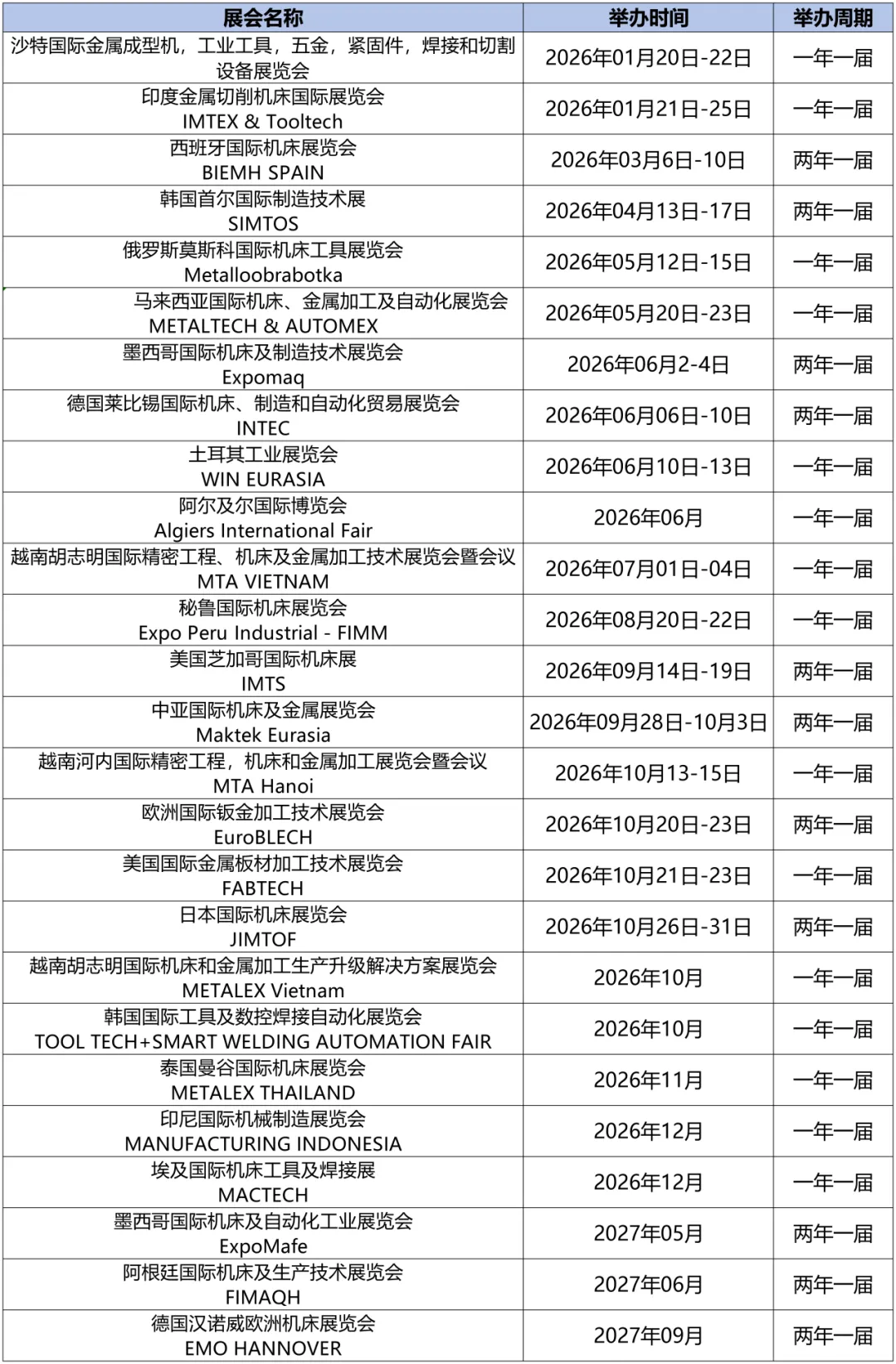 2026年全球机床金属展会计划表