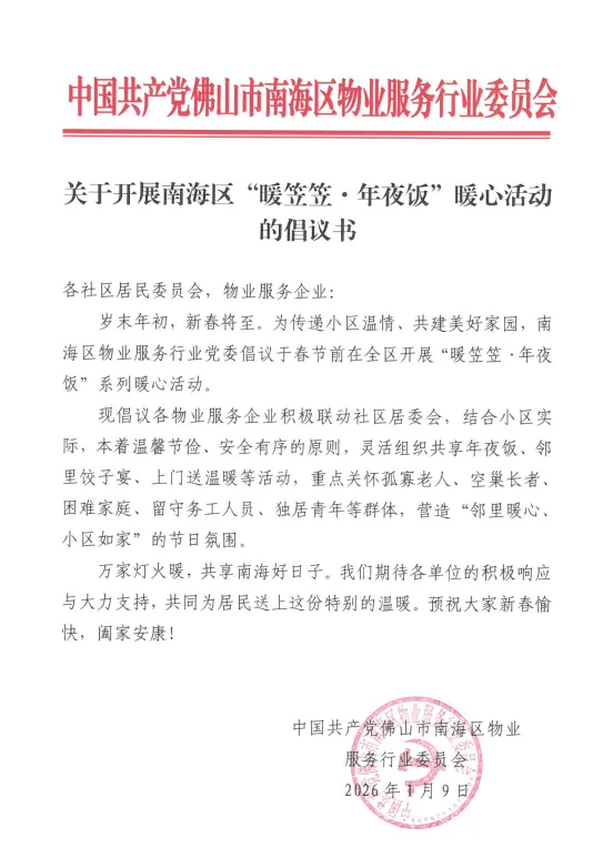 岁末年初,新春将至。中国共产党佛山市南海区物业服务行业委员会发起“暖笠笠・年夜饭”暖心活动倡议,号召物业行业联动社区传递温情、共建美好家园。中共佛山市南海区物业管理行业协会支部、佛山市南海区物业管理行业协会会长何国光第一时间积极响应倡议,要求协会秘书处牵头组织会员企业开展系列暖心活动,让邻里温情浸润南海,让小区满溢如家暖意,以浓浓年味绘就新春美好图景。