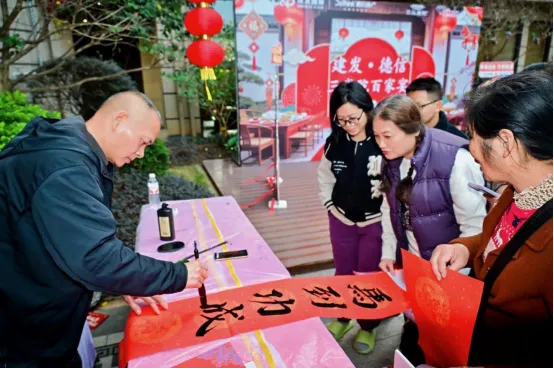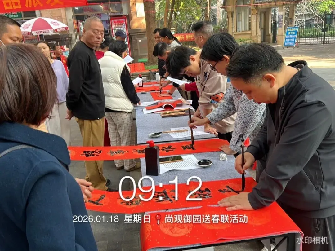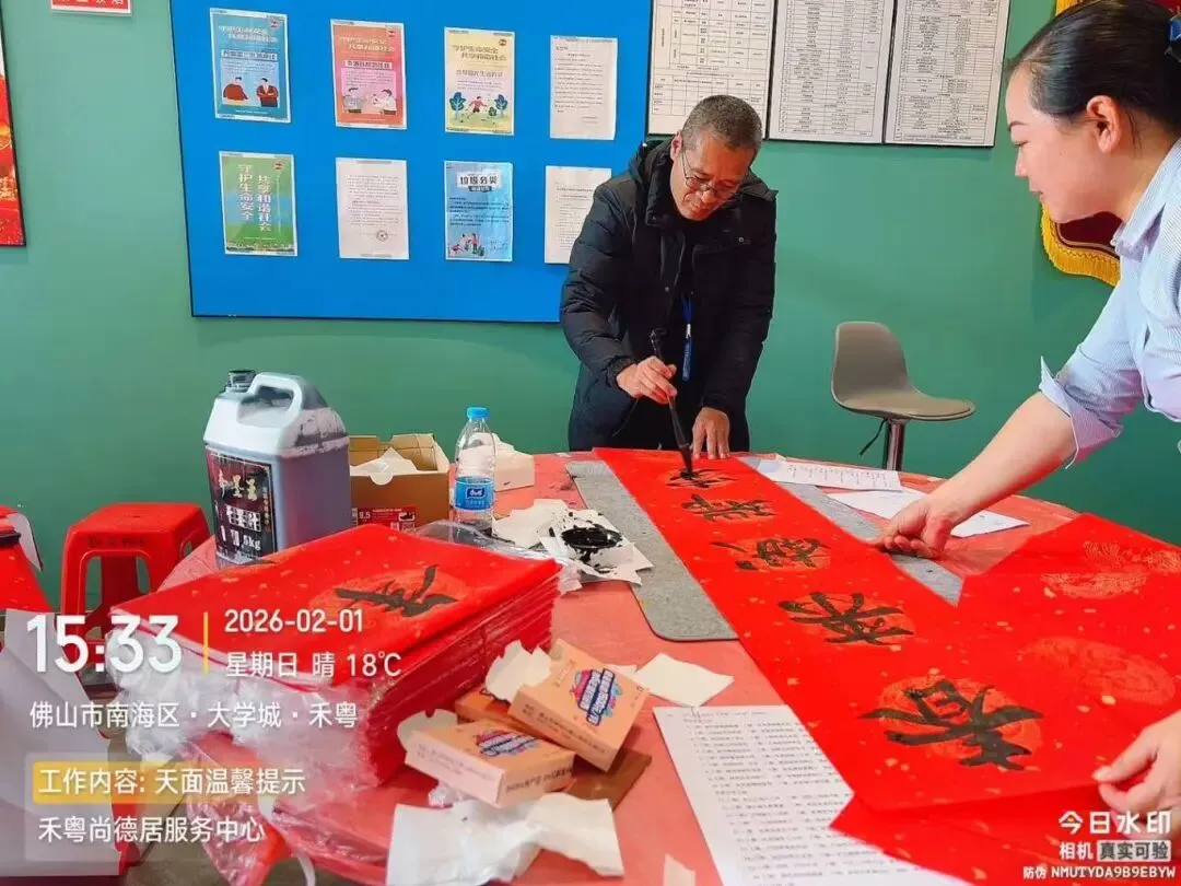 近日,佛山市南海区豪信物业尚观御园开展暖心送春联活动,积极响应“暖笠笠・年夜饭”倡议,为业主传递新春祝福。活动现场,红纸翻飞、墨香萦绕,工作人员与书法爱好者一同挥毫泼墨,将对新春的期许、对生活的美好祝愿,倾注于笔端纸上。