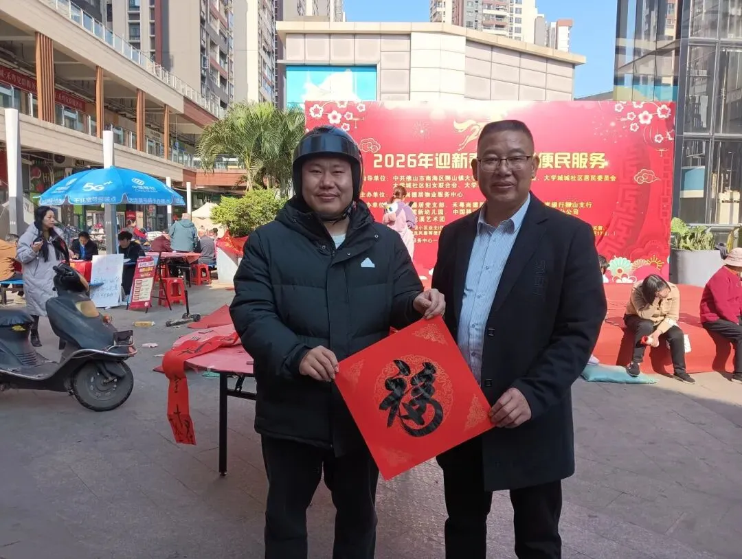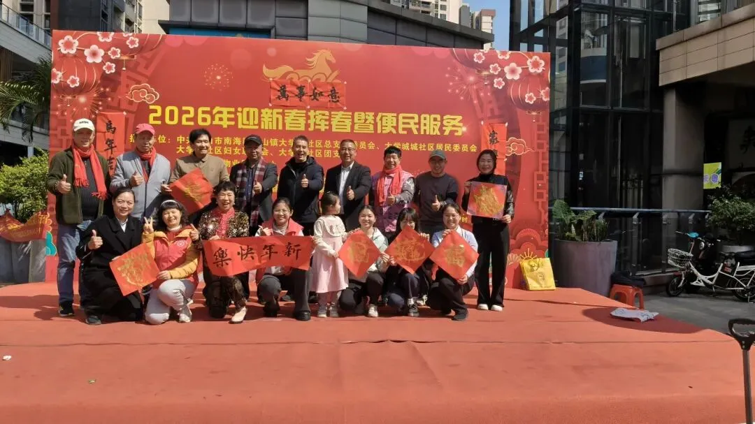 2026年2月1日,鑫安阳光物业管理(佛山市南海区)有限责任公司禾粤尚德居物业服务中心,携手星辉学校、中国移动狮山营业厅、浦发银行狮山营业厅,以及10名书法老师、4名志愿者,共同举办 “2026客户预存有礼暨挥春便民服务” 活动,以传统文化方式共迎福气满满的马年新春。