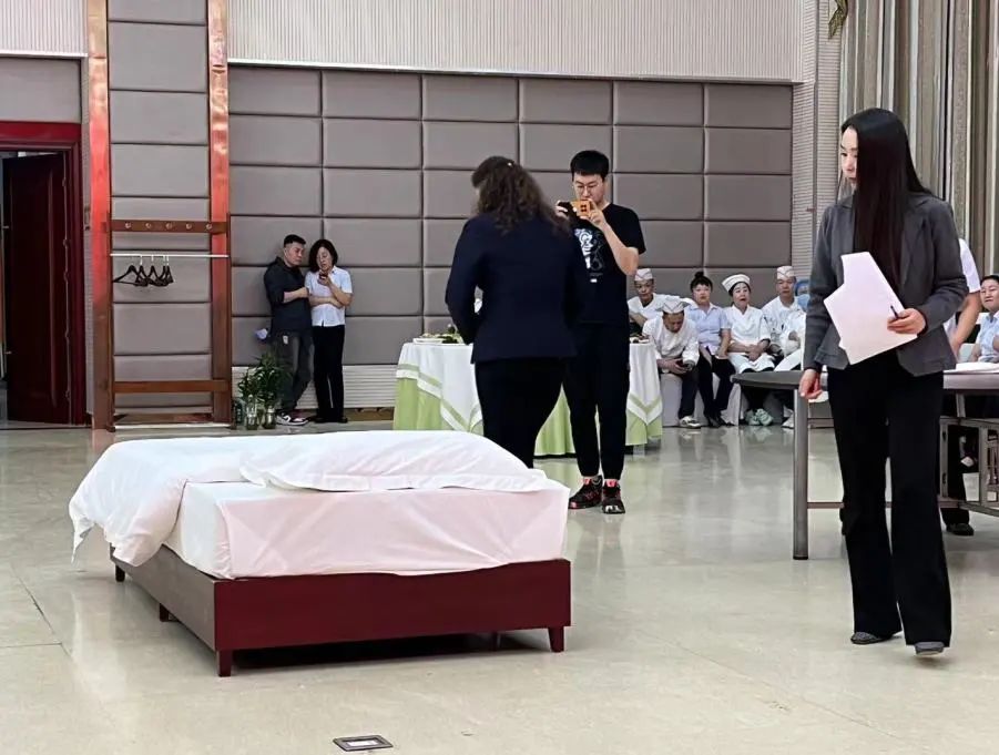 服务技能比赛过程中,参赛职工纷纷亮出看家本领,礼仪展示、铺桌布、摆餐具、叠折花,一项项工序进行的有条不紊,一系列行云流水的操作展现出参赛职工的风采与专业素养。最终,中式摆台组一等奖由赵金燕夺得,高海娟获得二等奖;中式铺床组一等奖由宋海燕夺得,丁志华、刘敏慧分别获得二三等奖。