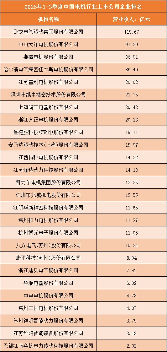 根据申万行业分类,2025年1-3季度中国电机行业上市公司按营业收入排名如下:(A股上市公司)