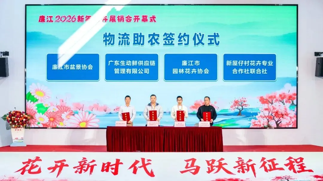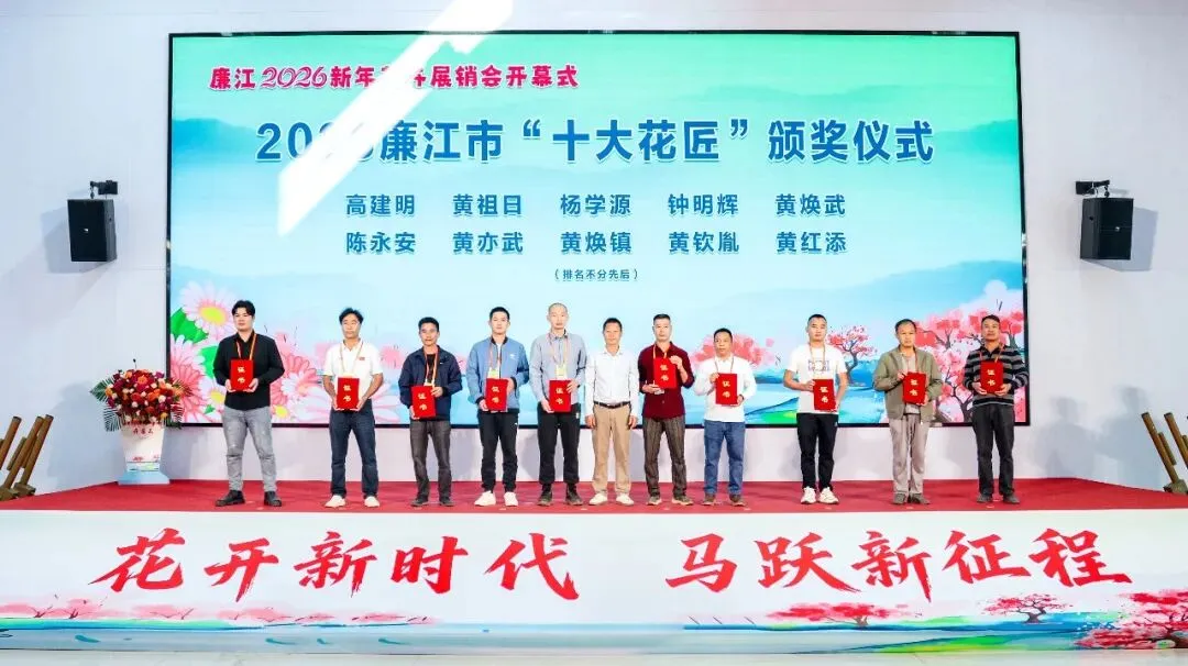 现场还举行了物流助农签约仪式,广东生动鲜供应链管理有限公司与相关协会、合作社签署合作协议,助力打通产销对接堵点。期间,主办方为2025年度廉江市“十大花匠”颁发证书,表彰他们在花卉种植技艺传承与产业提质升级中的卓越贡献。