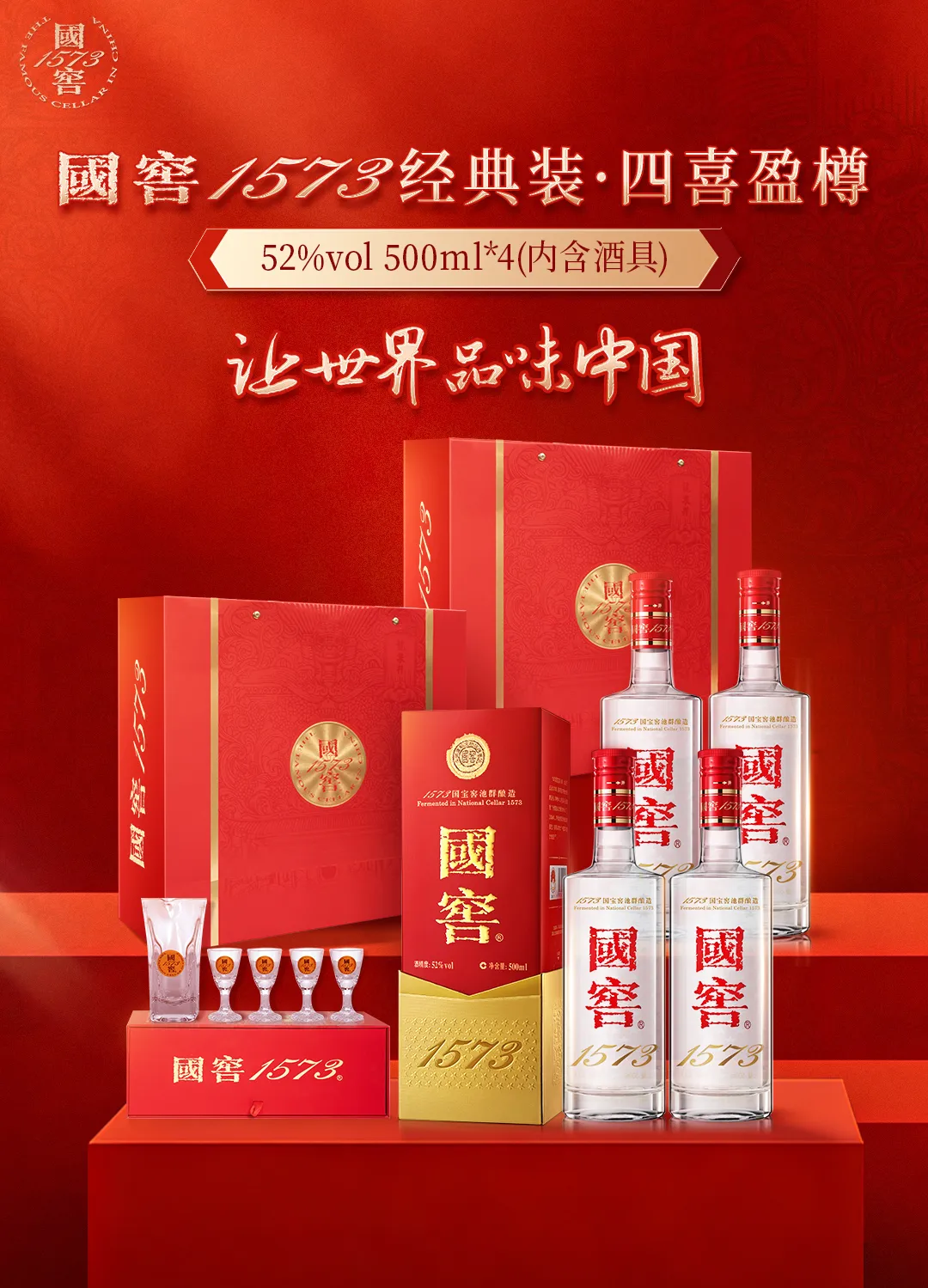 2月3日,国窖1573(四喜盈樽)贺岁上市。「四喜盈樽」的“四喜”,呼应“人生四喜”,是藏满新春期许的美好寓意,更是为马年添福:久旱逢甘露——愿你所求皆如愿,困境遇转机;他乡遇故知——愿你天涯有知己,相逢皆暖意;洞房花烛夜——愿你良缘常相伴,岁月皆温柔;金榜题名时——愿你奋进皆有果,前程皆璀璨。国窖1573「四喜盈樽」含4瓶52%vol经典国窖500ml、定制专业酒具2套、专属高端礼袋2个。场景方面,无论家族家宴、好友小聚还是商务宴请,国窖1573「四喜盈樽」都能从容拿得出手;红金配色喜庆大气,送长辈、送客户、送挚友都有面子,把心意送到心坎里。