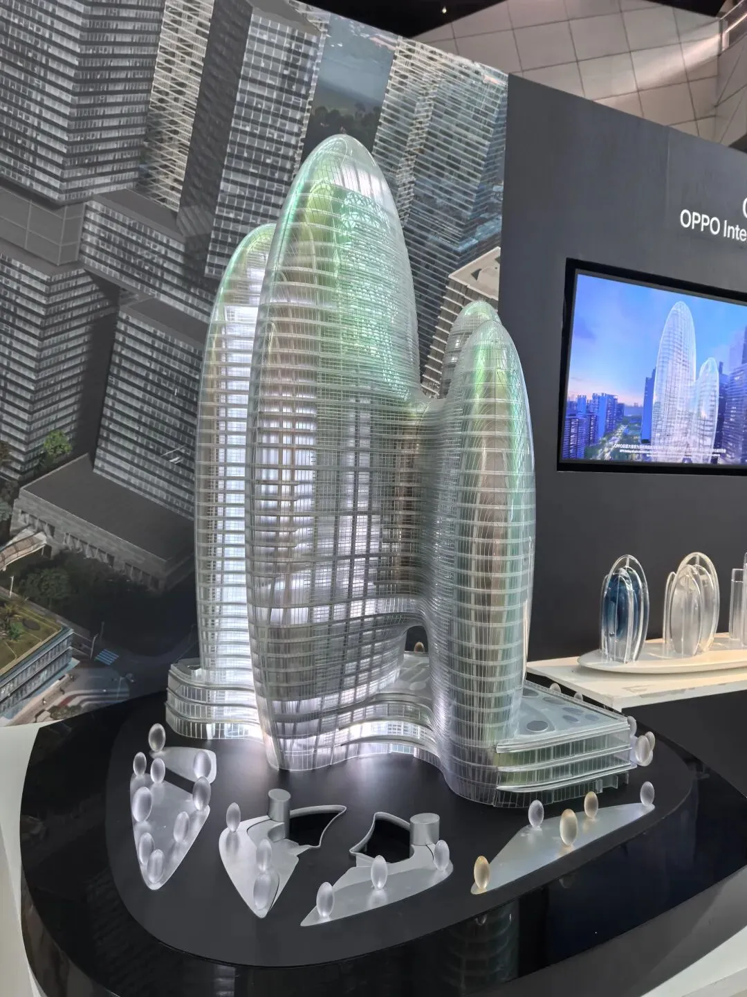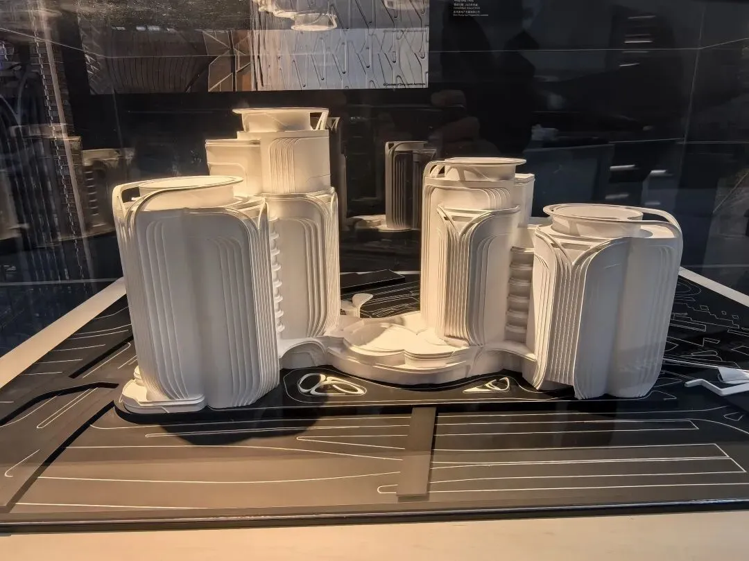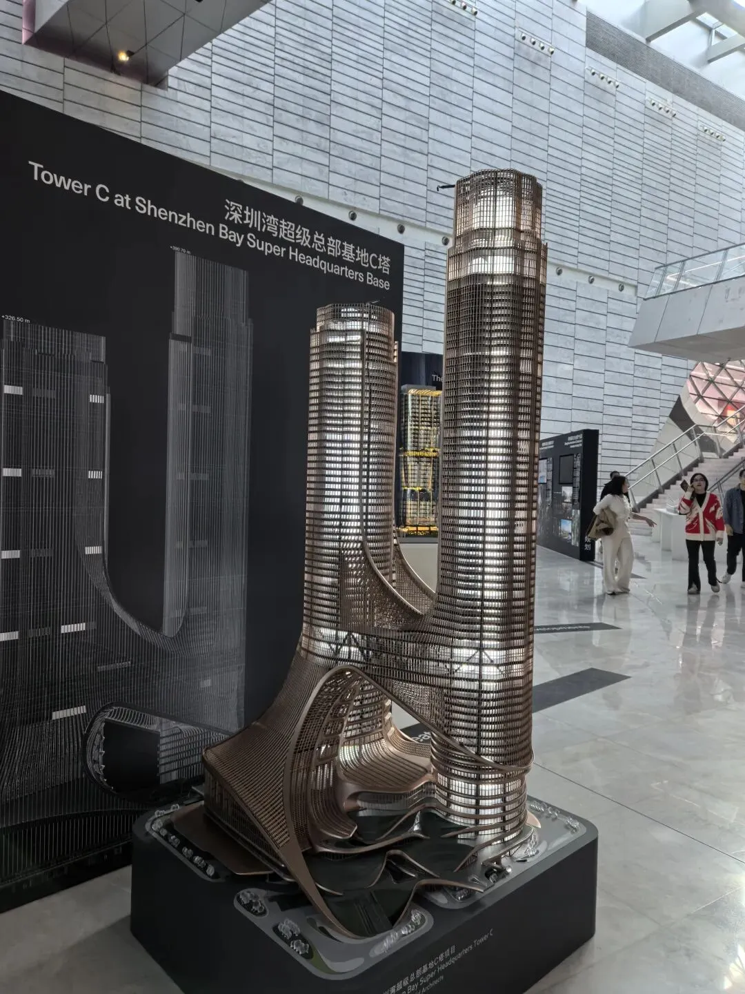 展会上的模型呈现四座塔楼相连、自上向下收束的橄榄形态,参数化算法优化了塔楼朝向,最大化深圳湾景观视野。作为艺术生,惊叹于“上帝曲线”的流畅;作为 UX 设计师,注意到低层收缩留出的公共空间,以及塔楼内部的垂直流动动线,参数化让“建筑形态”与“城市体验、使用功能”深度绑定。