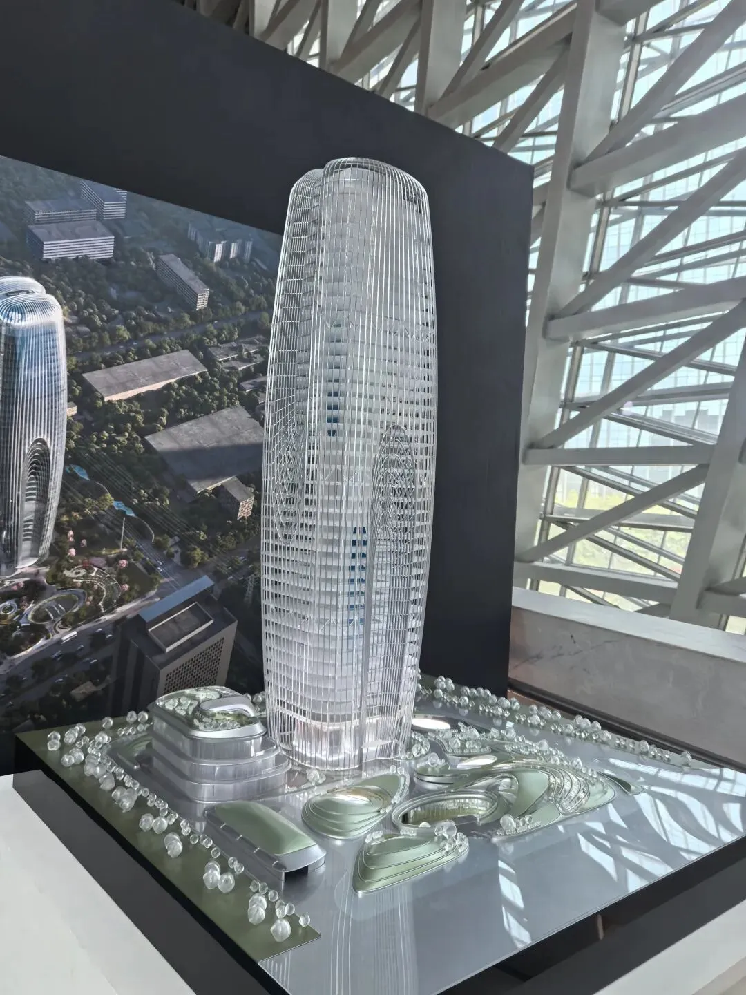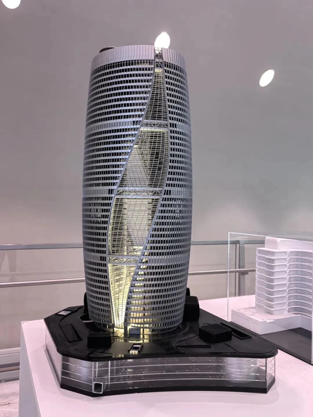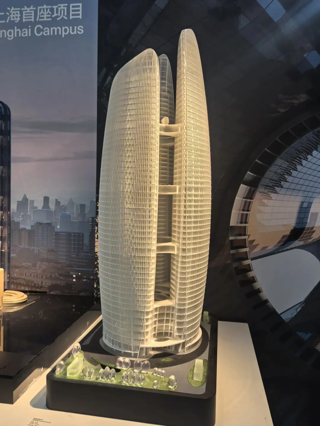 展会上的模型呈现四座塔楼相连、自上向下收束的橄榄形态,参数化算法优化了塔楼朝向,最大化深圳湾景观视野。作为艺术生,惊叹于“上帝曲线”的流畅;作为 UX 设计师,注意到低层收缩留出的公共空间,以及塔楼内部的垂直流动动线,参数化让“建筑形态”与“城市体验、使用功能”深度绑定。