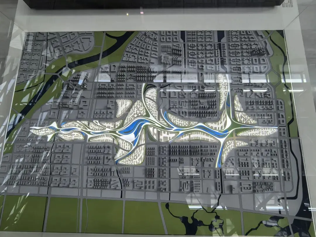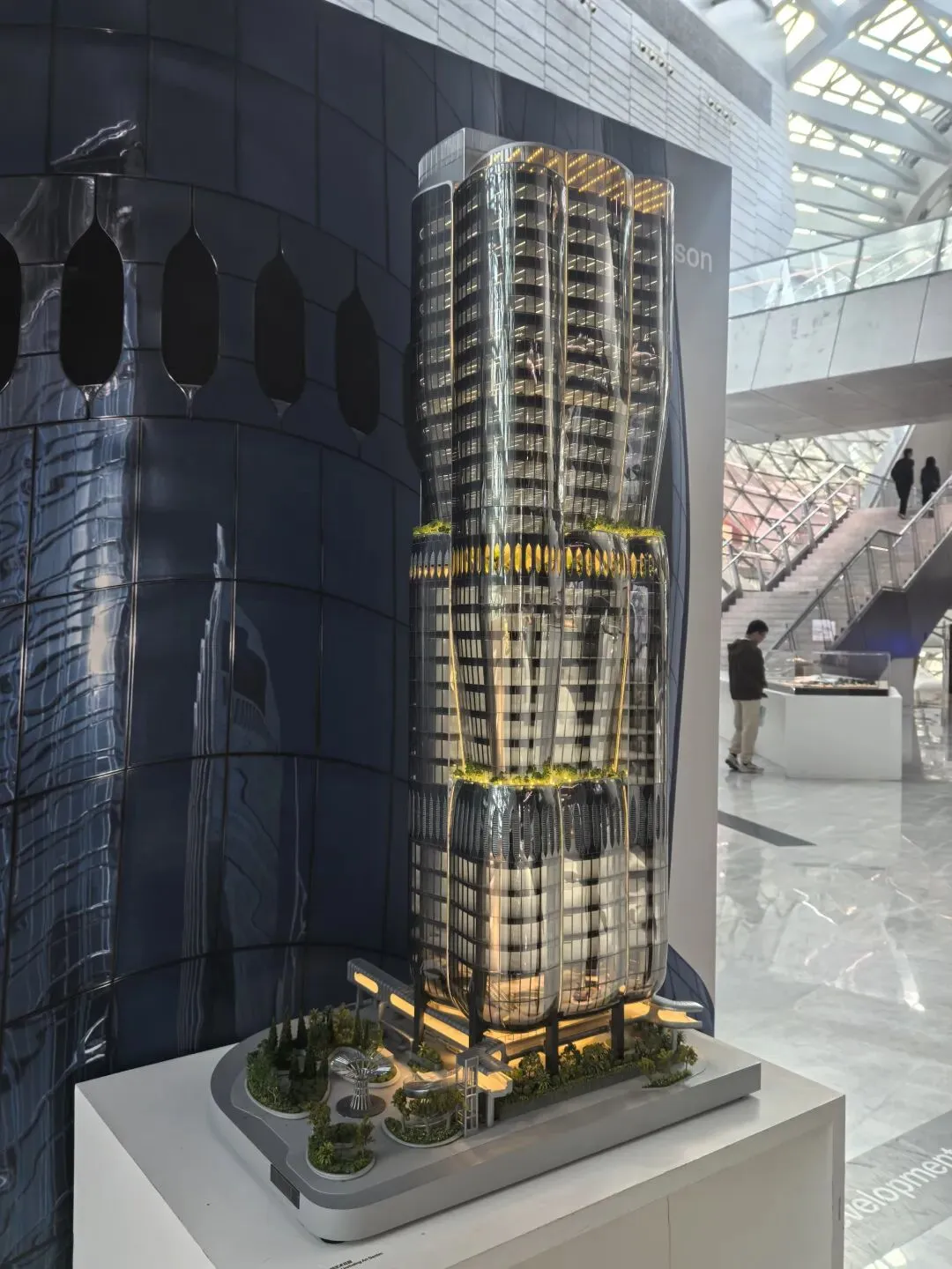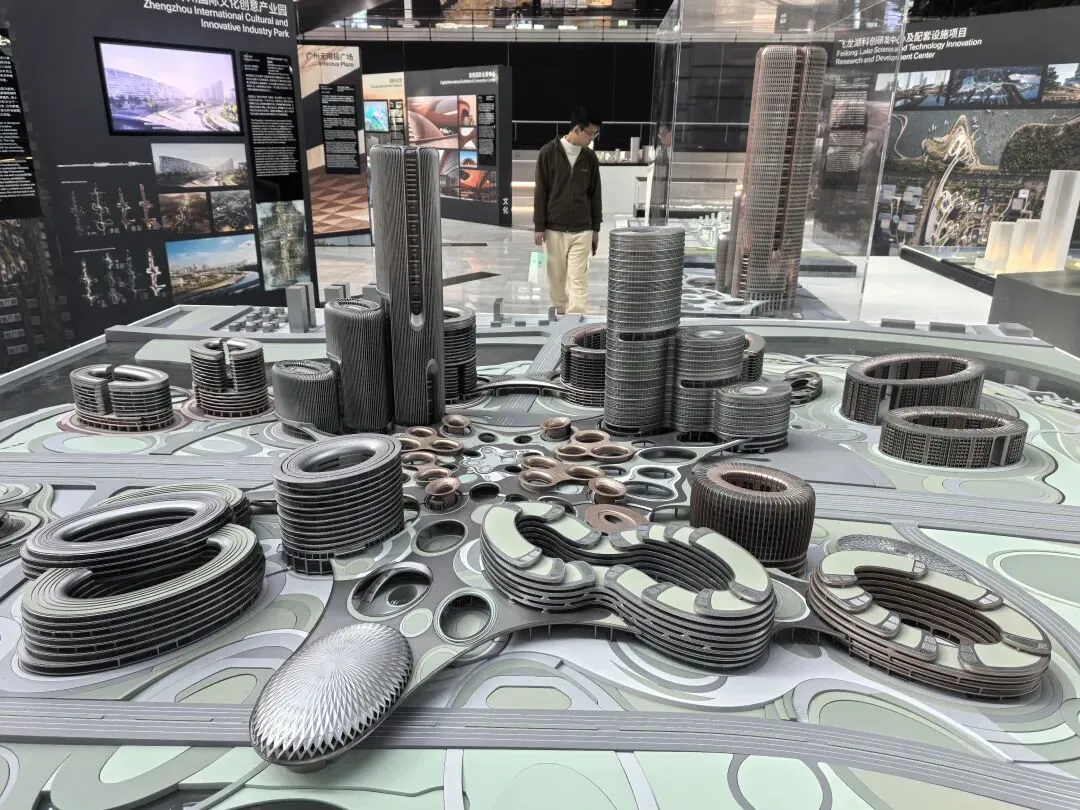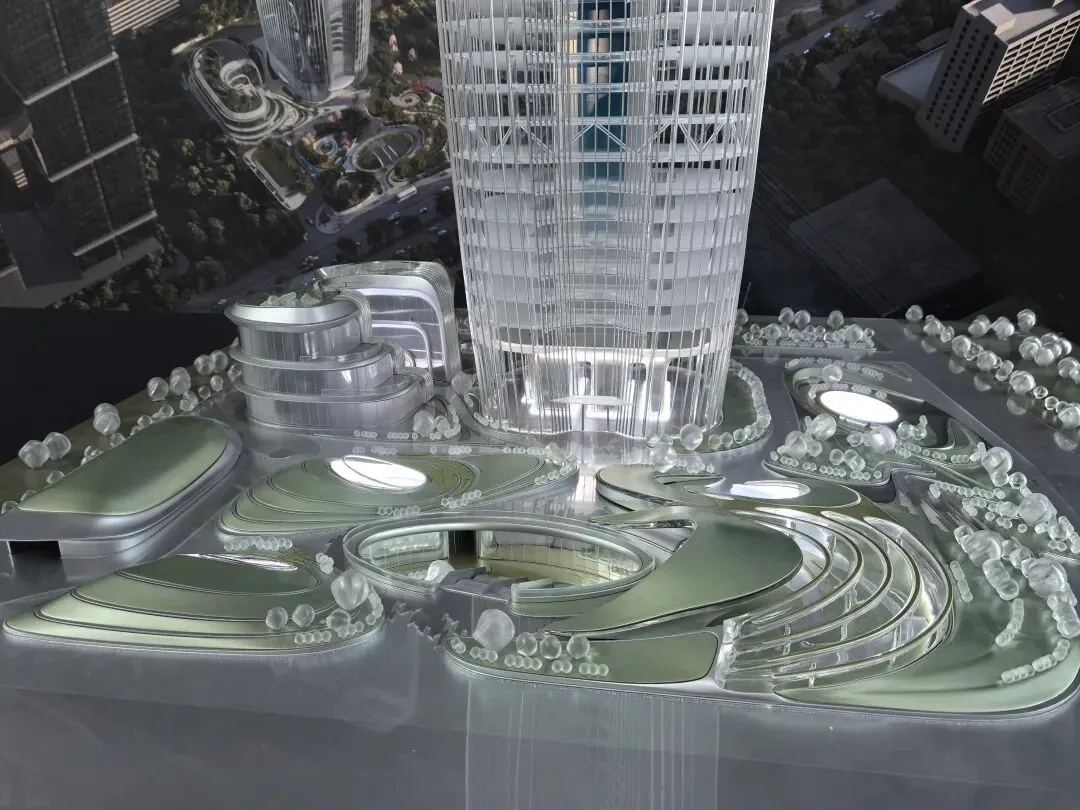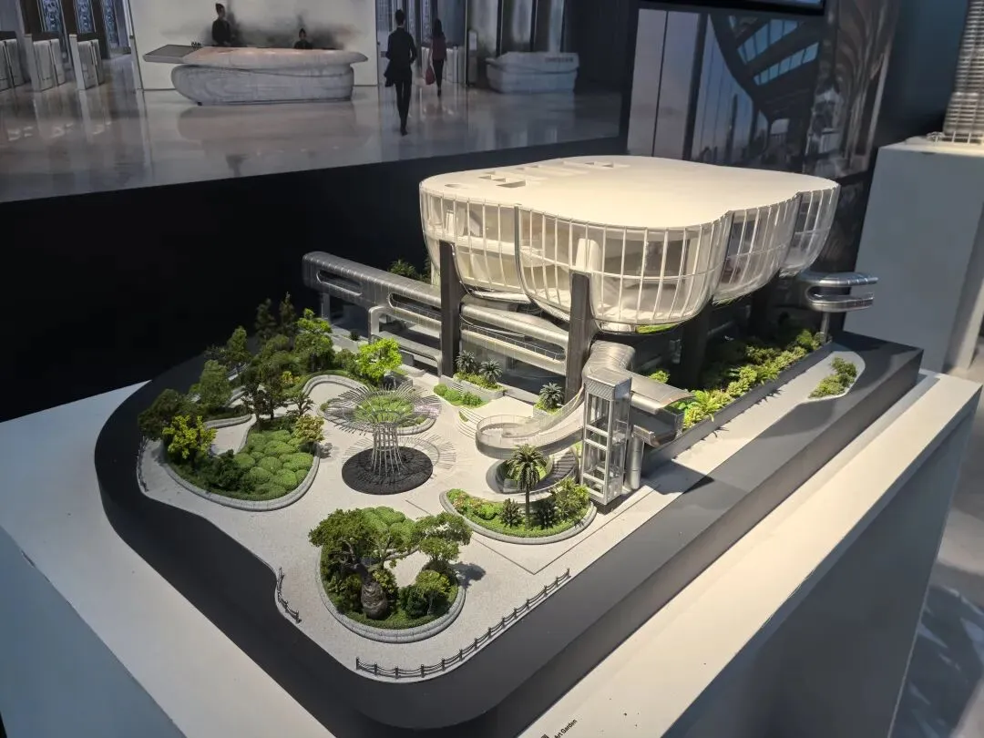 展会上的模型呈现“双人起舞”的形态,分层设计整合城市绿轴、公共广场与建筑内部空间。作为艺术生,被其“动态共生”的形态打动;作为UX设计师,注意到环形公共休闲区与空中连廊,让市民可在建筑中漫步、俯瞰山海,实现“总部建筑与公共空间、城市景观的无界融合”。