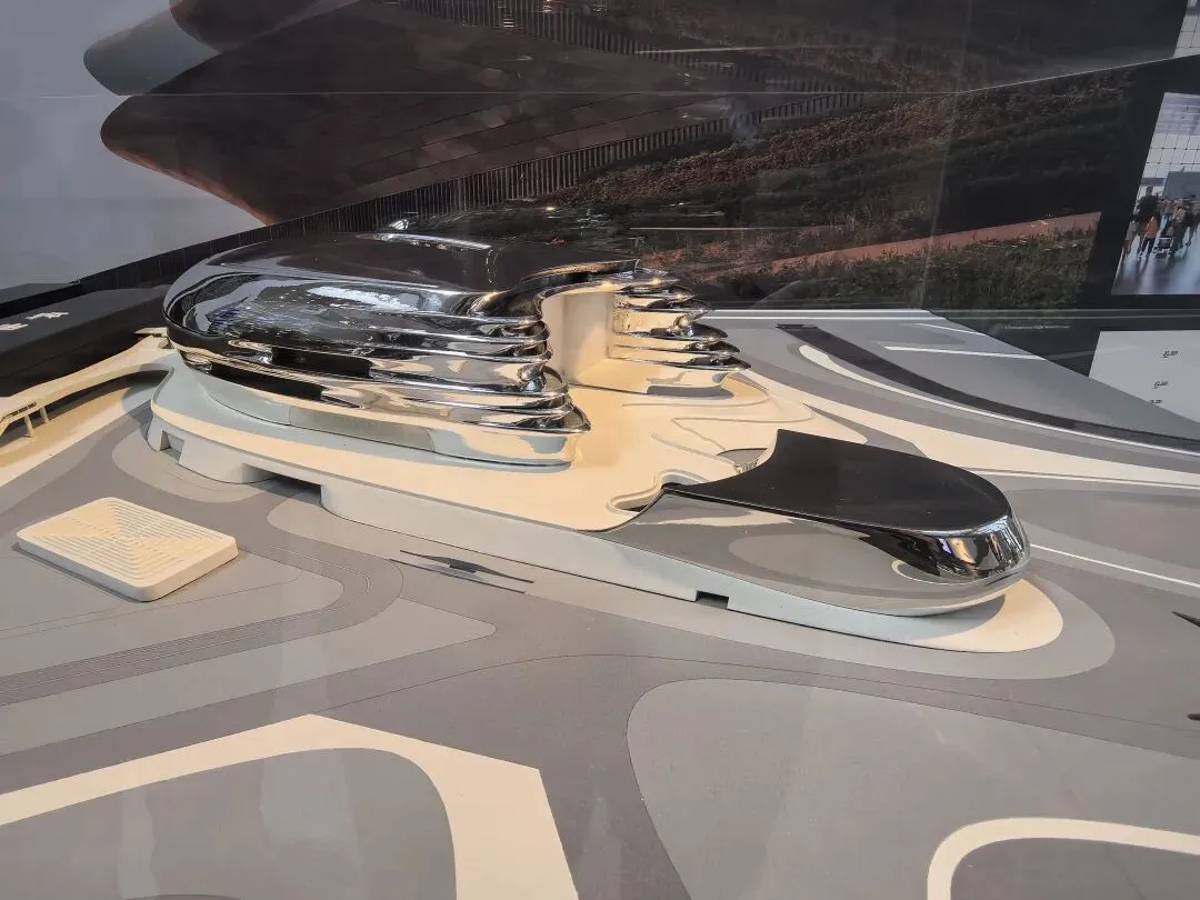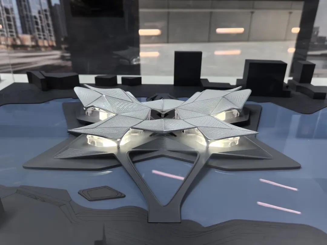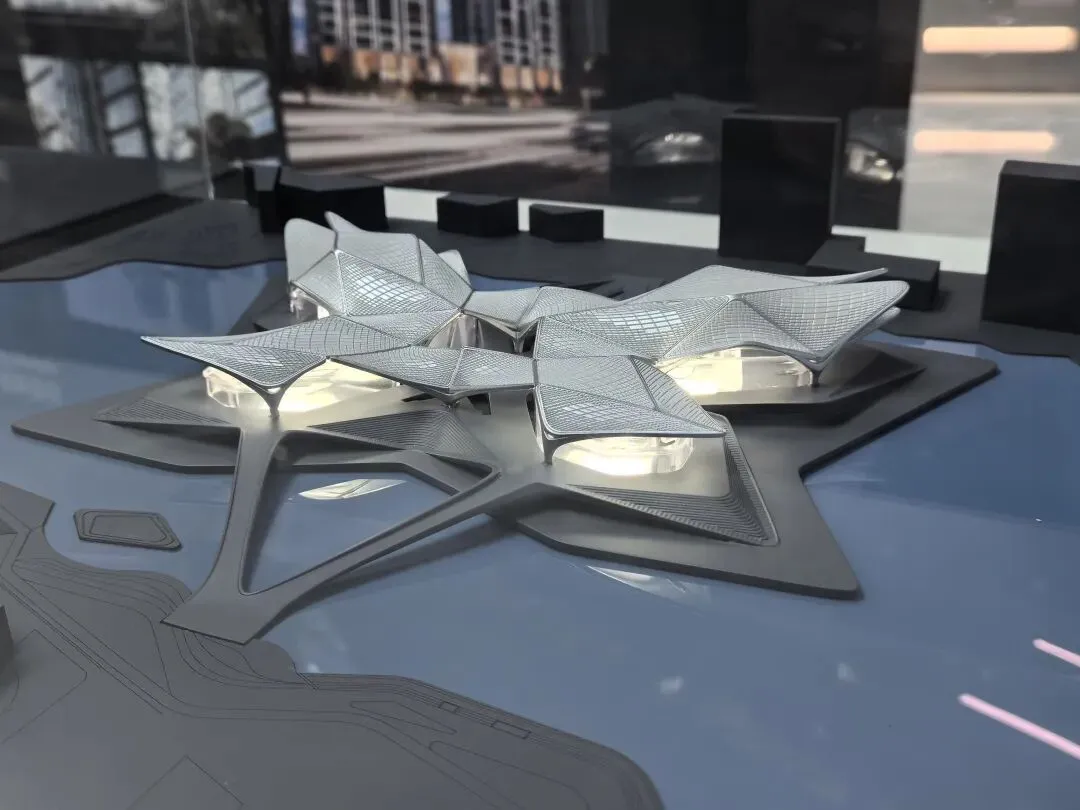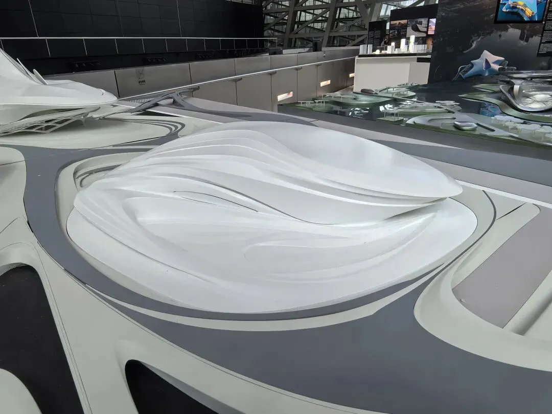 展会上的模型呈现出 U 形悬浮的流线形态,金属质感的曲面从顶部自然垂落,开口设计与城市公园无缝衔接。作为美术生,我被其“天外来物”般的未来感吸引;作为 UX 设计师,注意到其内部无柱化空间与连续的参观流线,让科普体验不受空间束缚,实现“建筑与城市、人的流动共生”。
