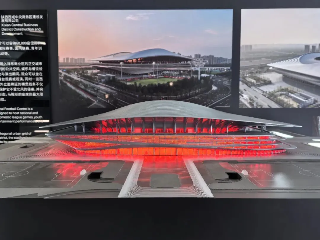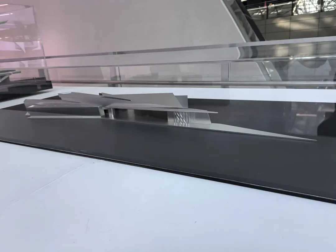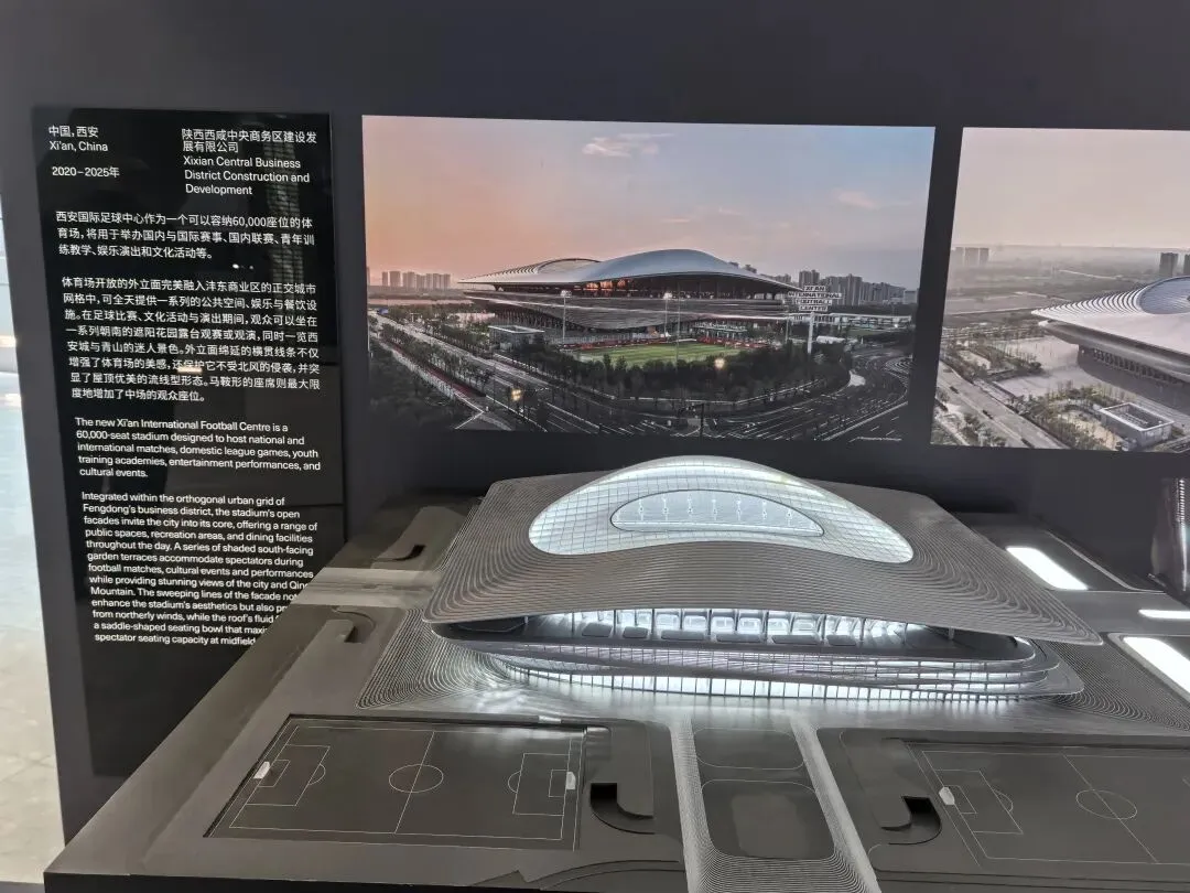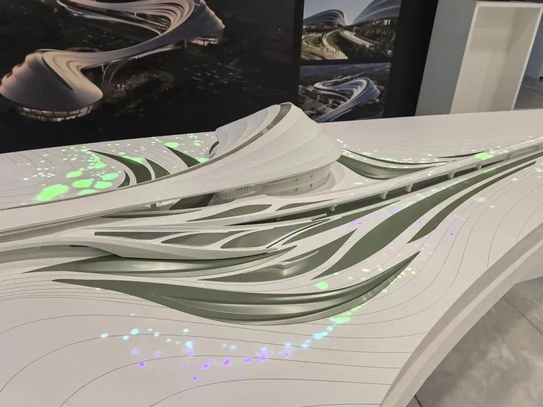 展会上的模型呈现出 U 形悬浮的流线形态,金属质感的曲面从顶部自然垂落,开口设计与城市公园无缝衔接。作为美术生,我被其“天外来物”般的未来感吸引;作为 UX 设计师,注意到其内部无柱化空间与连续的参观流线,让科普体验不受空间束缚,实现“建筑与城市、人的流动共生”。