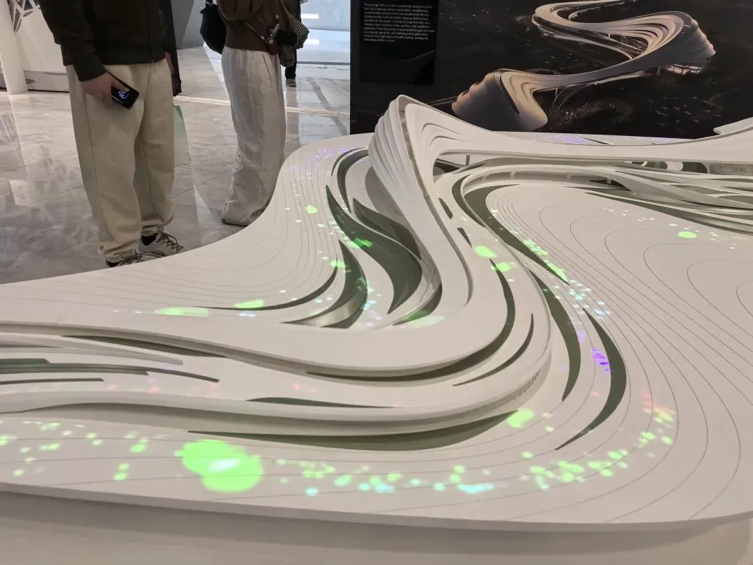 除了实体建筑模型,展会的数字孪生展厅(1:1复刻云端展厅)、头脑风暴互动装置(脑电波生成建筑形态),让我直观感受到扎哈理念的未来延伸——数字技术让建筑设计从“实体”走向“虚实共生”,AI与交互技术让“人人皆可参与设计”,完美诠释了她“以技术拓展建筑边界”的未来主义主张。