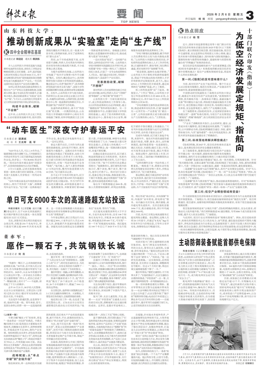 近日,《科技日报》以《山东科技大学:推动创新成果从“实验室”走向“生产线”》为题,报道了我校在促进科技成果转化方面的典型经验与显著成效。报道通过涂宝峰教授团队获五千万元产业化投入等生动案例,展现了我校如何以创新工作破解“不会转”“不想转”难题,让科技之花结出产业之果。这既是对学校长期以来坚持服务国家战略、贴近产业需求所获成绩的肯定,也彰显了我校以改革激发创新活力、以转化驱动新质发展的坚定路径。现全文转发,共同为山科人的创新实践点赞!