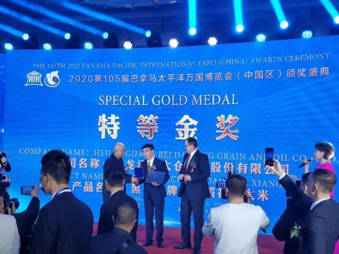 2020年11月8日19时50分,对于黑龙江省优质米企甚至黑龙江稻米行业来讲,是一个历史性时刻。当天,北大仓黑土地牌大米荣获2020第105届巴拿马太平洋万国(国际)博览会特等金奖。