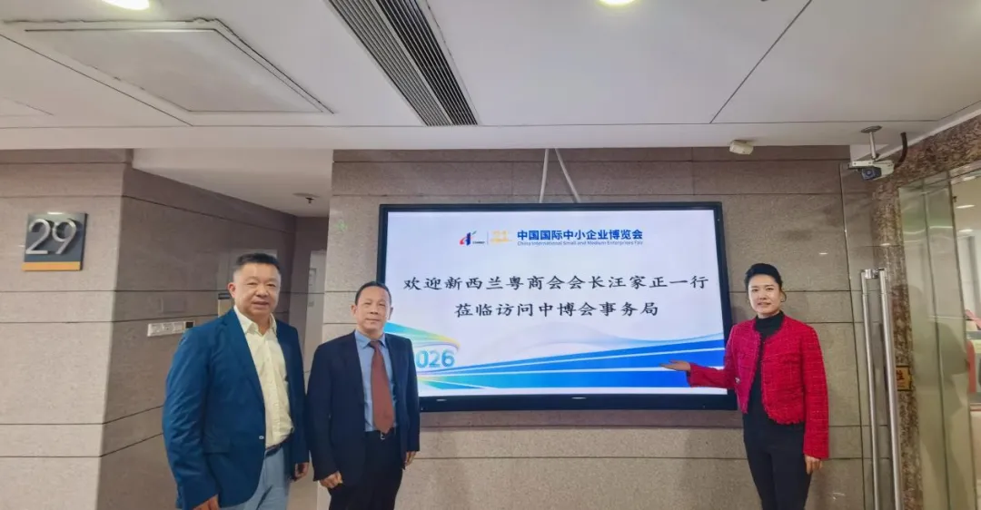 2026年2月4日,新西兰粤商会会长汪家正率副会长刘恒、副秘书长李琴一行,专程走访了中国国际中小企业博览会事务局(以下简称“中博会”),受到事务局副局长王福秀、国际合作部部长何燕等负责人的热情接待。双方围绕深化中小企业国际合作、把握年度重大经贸机遇等议题进行了深入交流。