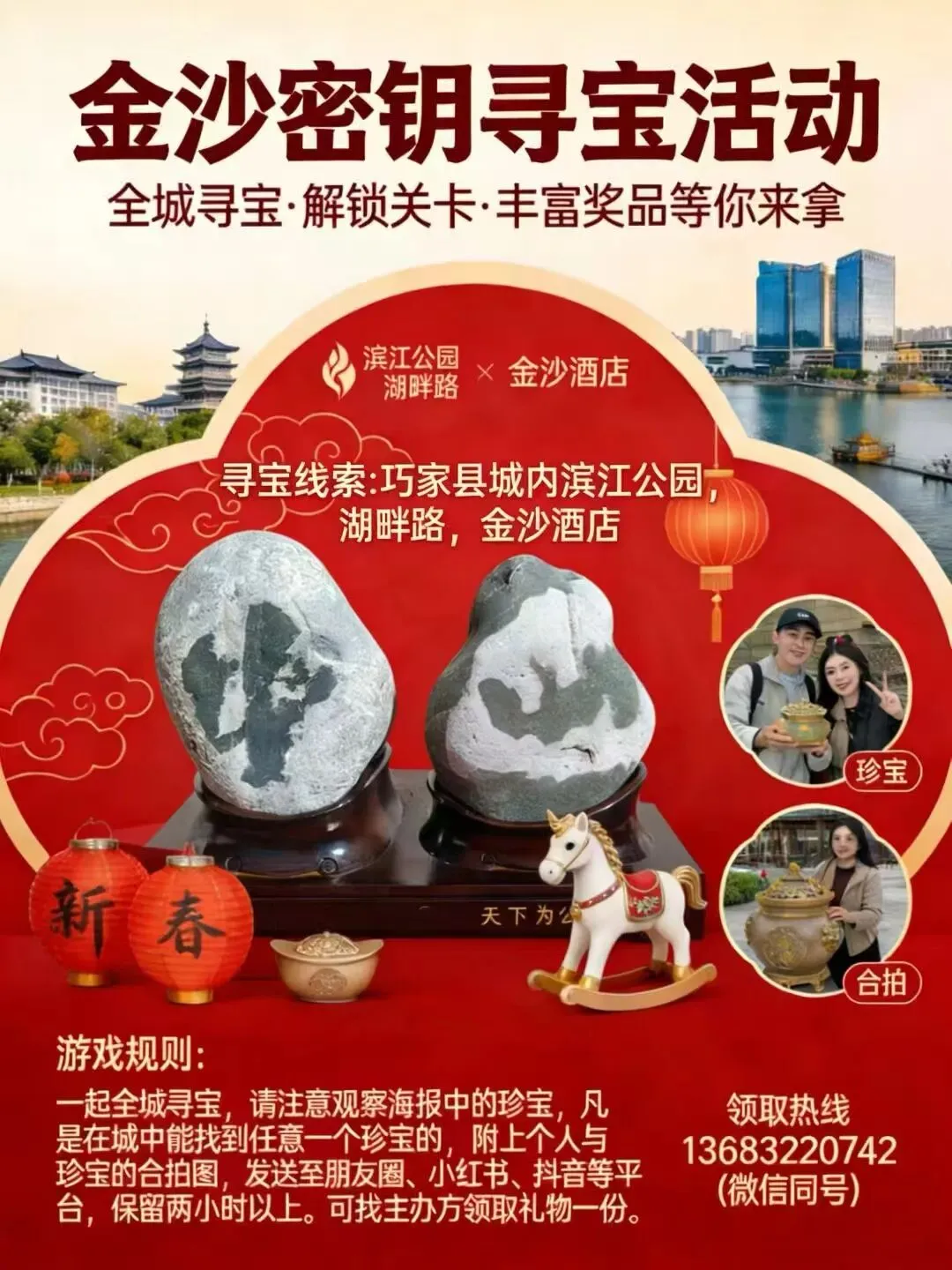 游戏规则:一起全城寻宝,请注意观察海报中的珍宝,凡是在城中能找到任意一个珍宝的,附上个人与珍宝的合拍图,发送至朋友圈,小红书,抖音等平台,加上地址定位,保留两小时以上。可找主办方领取礼物一份。领取热线:13683220742(微信同号)