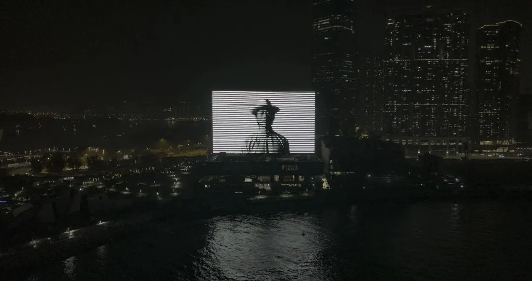 在M+幕墙上展出的《雍雀》,2024年,由巴塞尔艺术展及M+共同委约创作并由瑞银集团呈献,2024年,© 杨福东,摄影:Moving Image Studio,M+,香港
