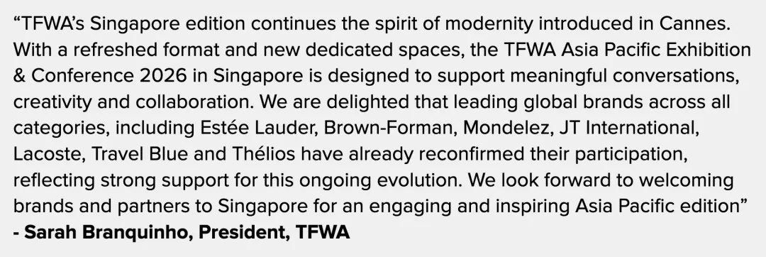 新加坡延续了戛纳展会所引入的创新精神。TFWA亚太区展览与会议2026将以焕新的形式与专属空间,促进深度对话、激发创意并加强协作。我们很高兴看到包括 Estée Lauder, Brown-Forman, Mondelez, JT International , Lacoste, Travel Blue和Thélios在内的全球领先品牌已确认继续参展,体现了业界对持续升级的强力支持。我们期待与品牌及合作伙伴相聚新加坡,共启这场引人入胜、富有启发的亚太盛会。