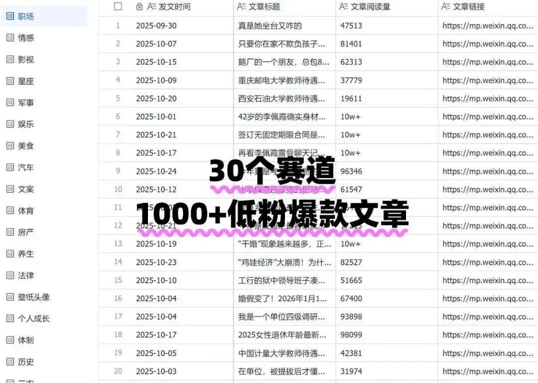 另外也给大伙配了: 20个赛道、1000个低粉爆款对标文章,想抄作业直接抄。