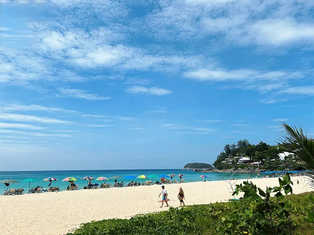 芭东海滩全长 3 公里,呈新月形,是普吉岛开发最完善的海滩,白天热闹非凡,水上活动丰富多样,沙滩上遍布遮阳伞和躺椅,背景是蓝天白云和清澈海水,远处可见岛屿轮廓。