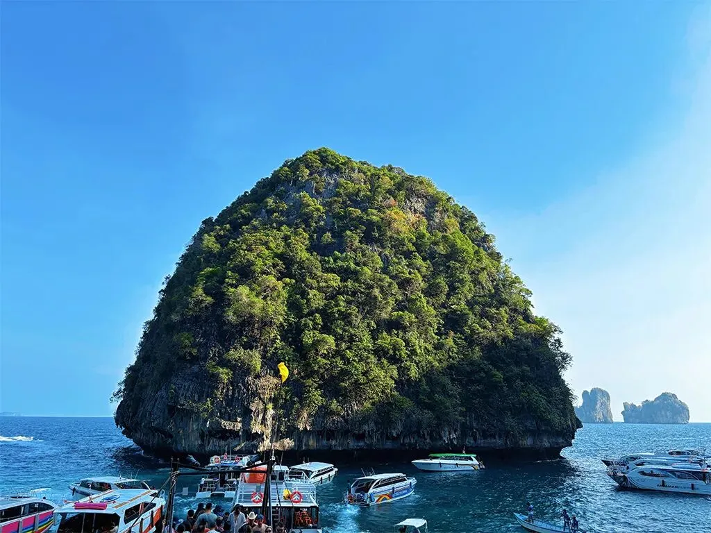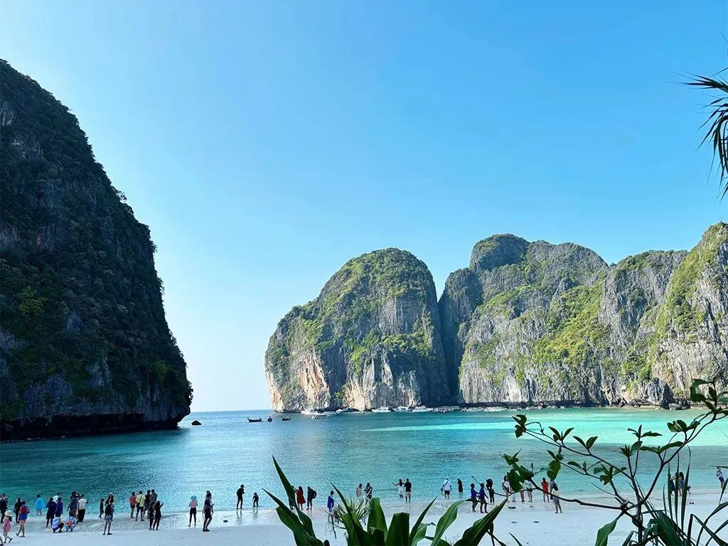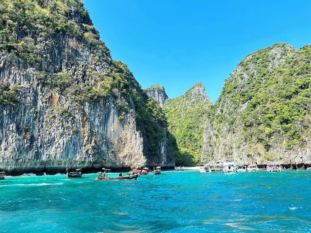皮皮岛玛雅湾,三面环山的海湾,海水绿如翡翠,沙滩细腻如粉,岩壁陡峭,形成天然屏障,秘境既视感满分,是电影《海滩》的取景地。